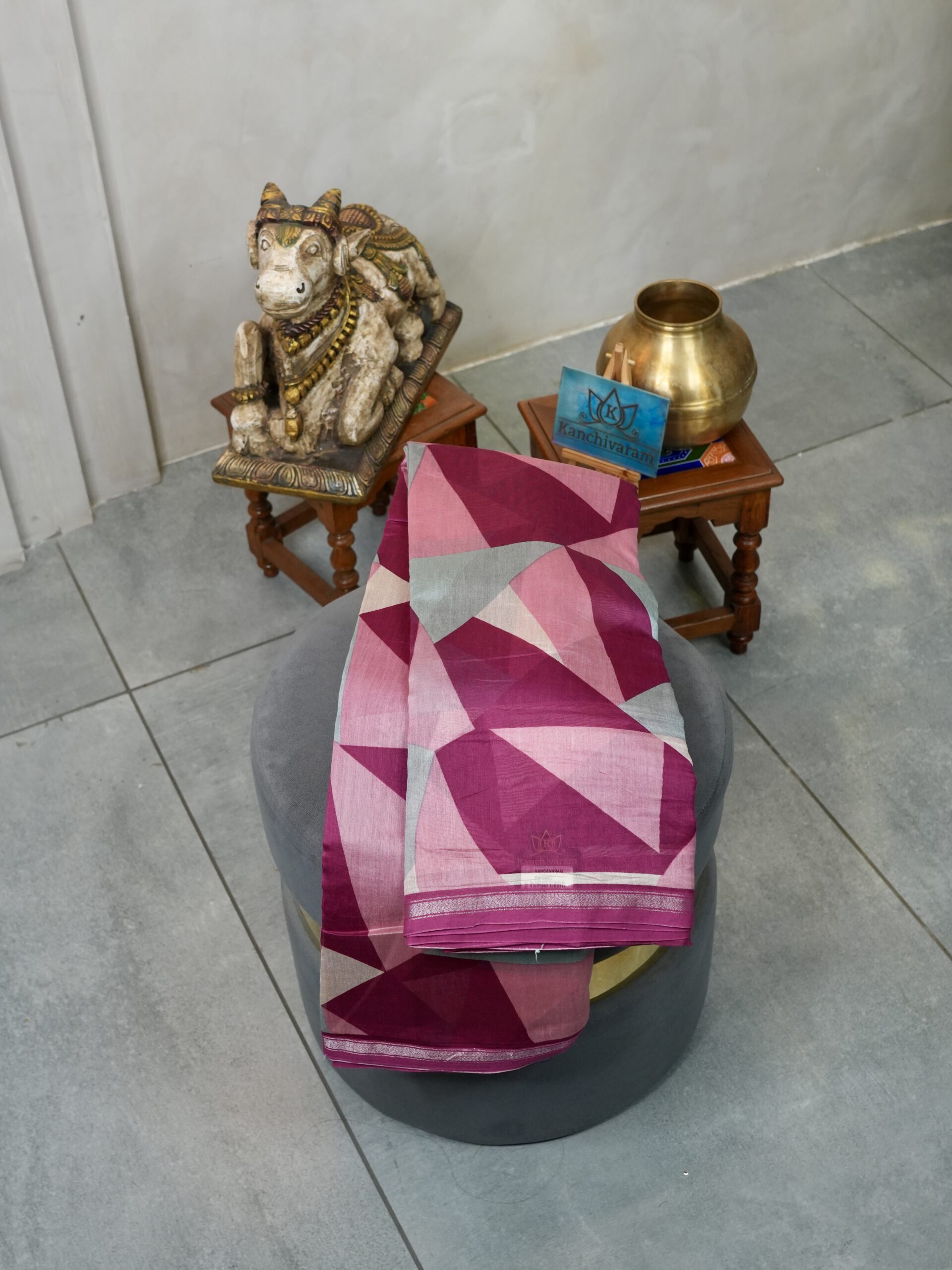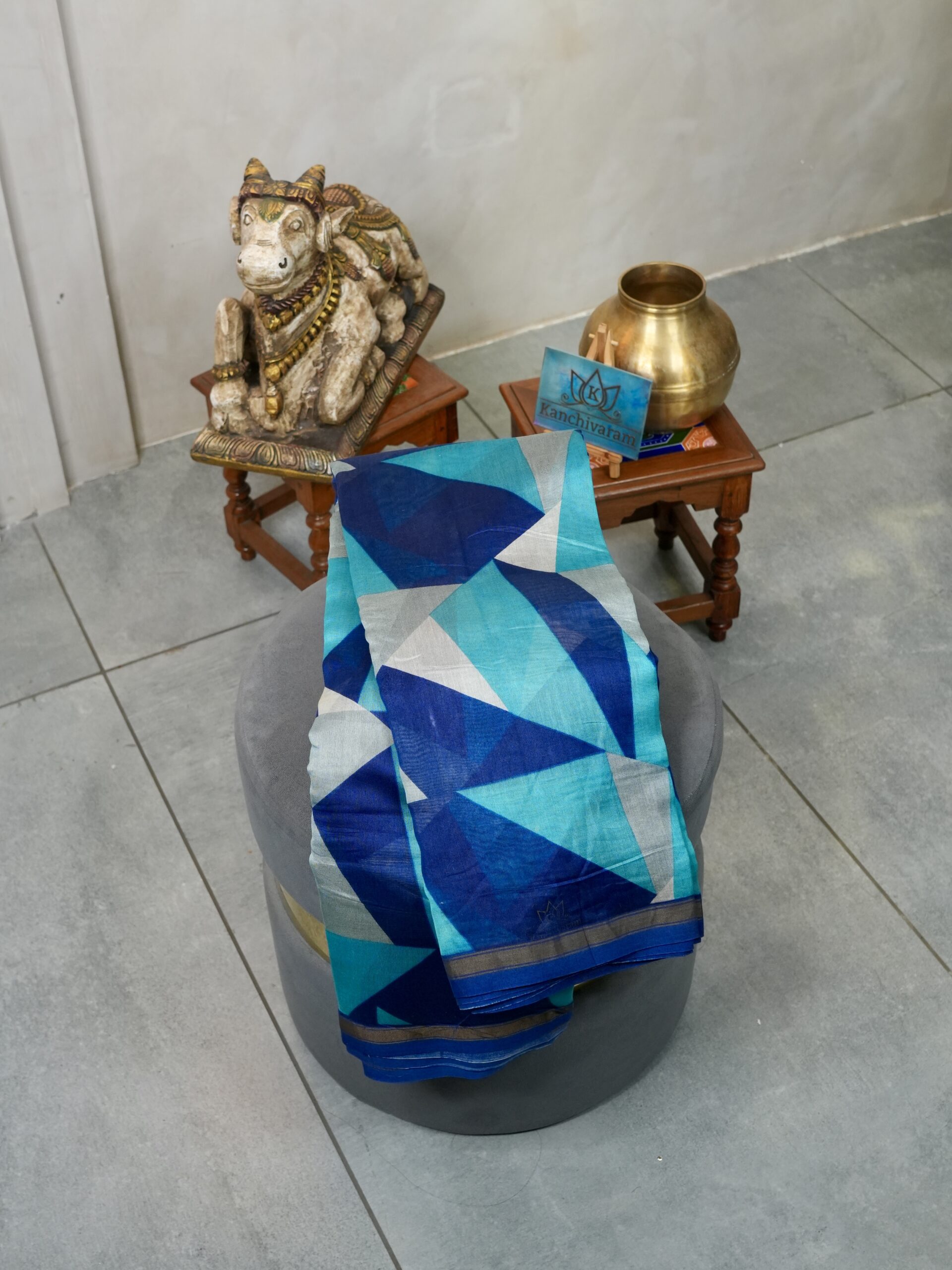 These Chanderi silk cotton sarees come in three stunning colour options, each featuring a bold geometric abstract print across the entire body. The pattern is made of overlapping triangular shapes in contrasting tones, creating a modern, contemporary look while keeping the drape light, airy, and easy to carry.
