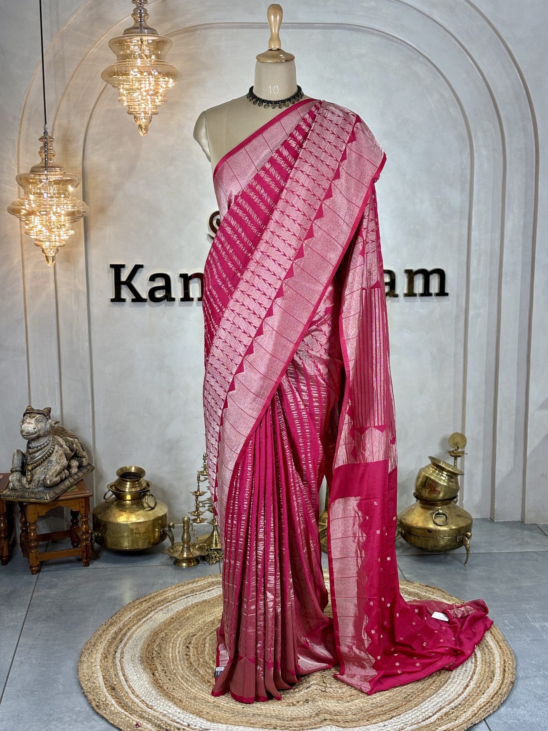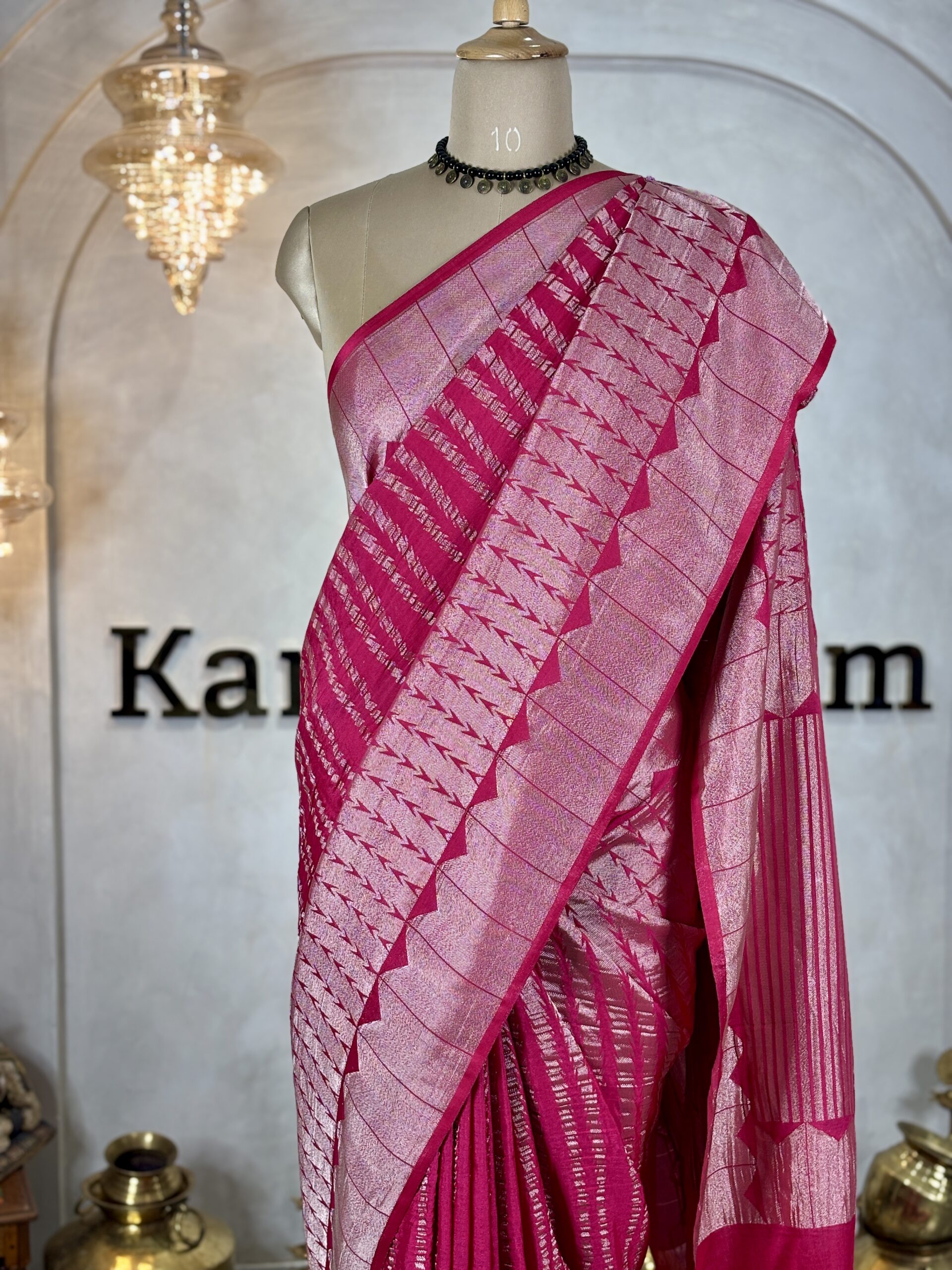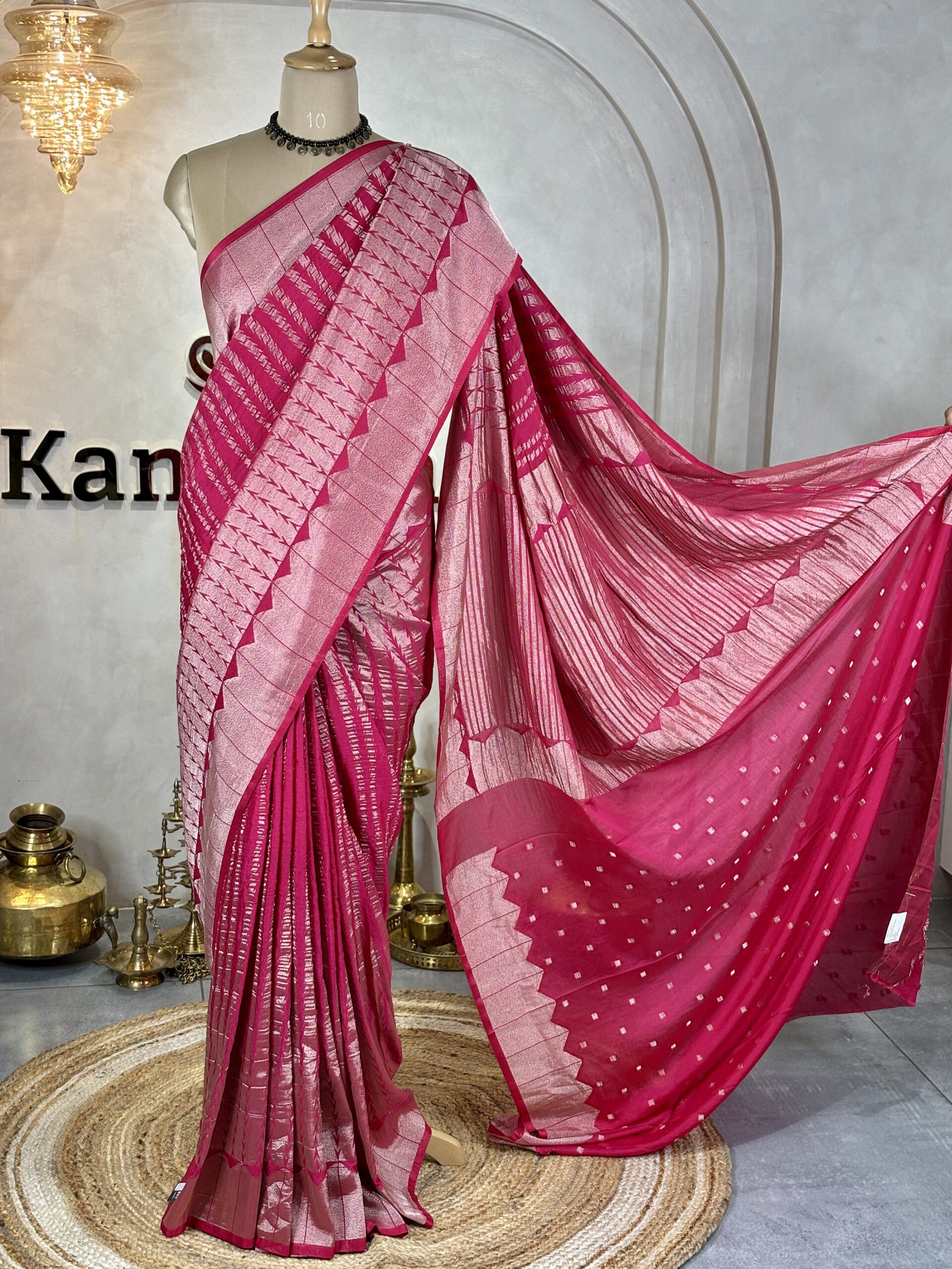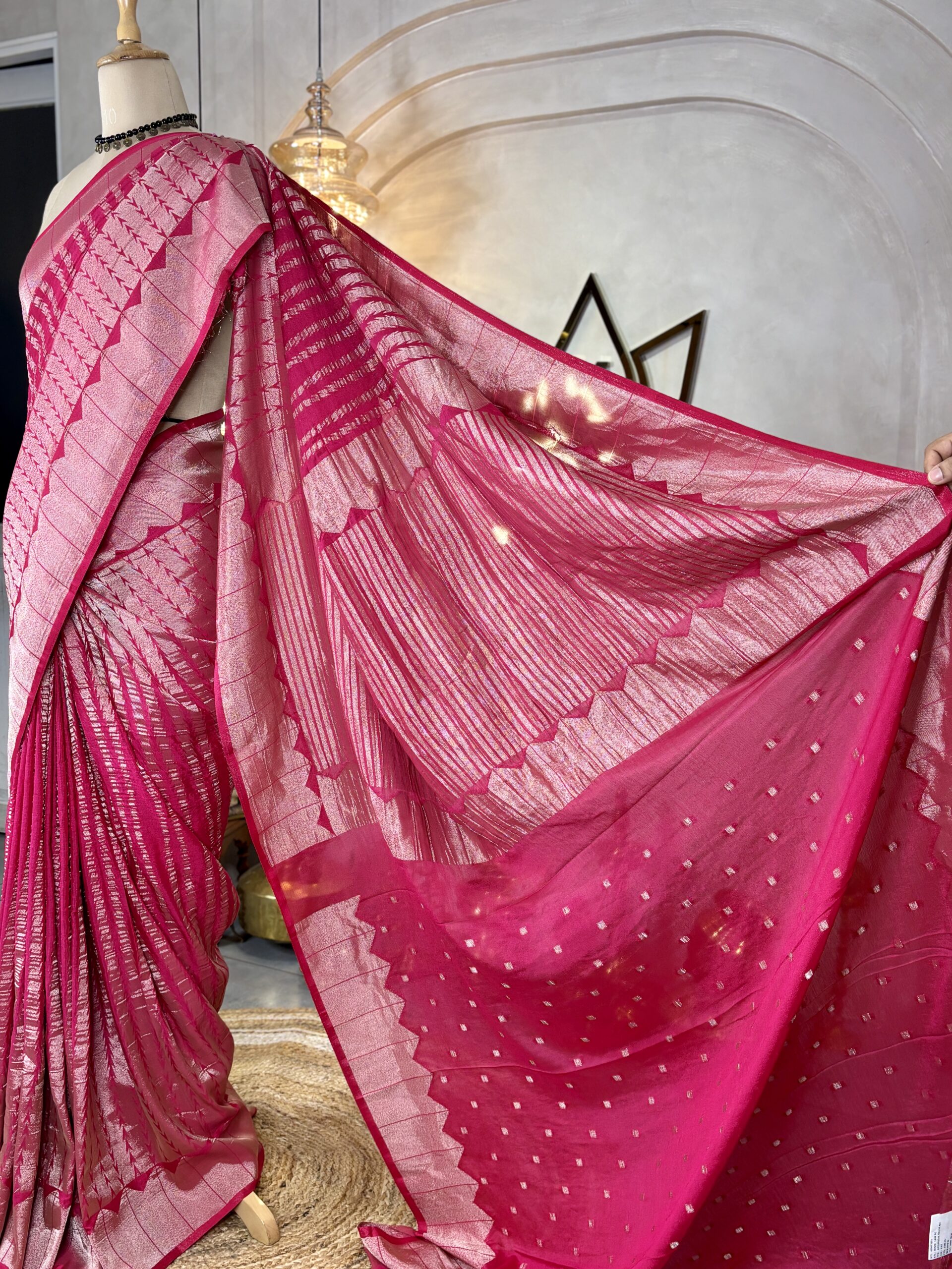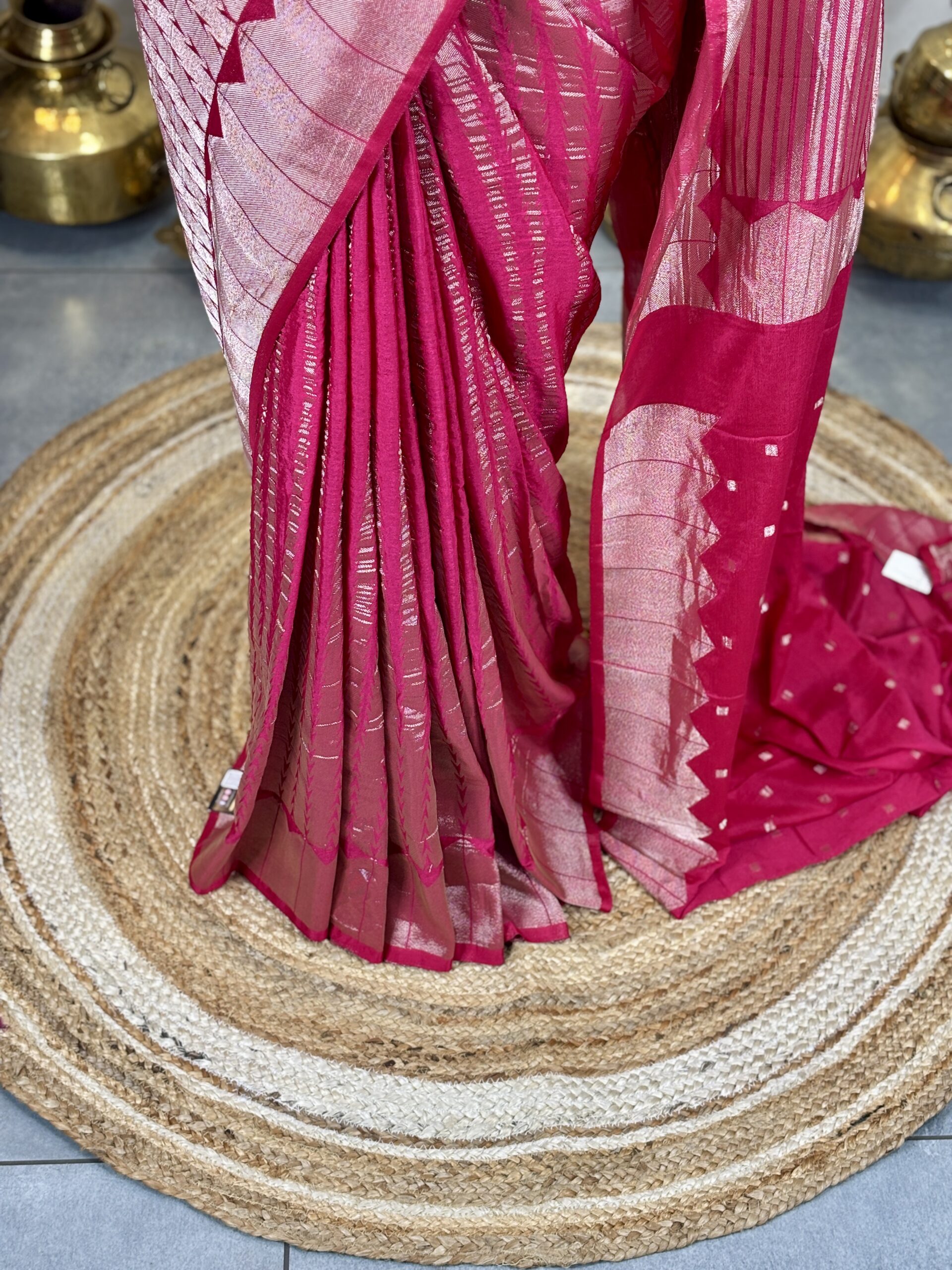 These art silk sarees are crafted in a smooth viscose base fabric and feature Banarasi-style zari work woven all across the body. The body is detailed with abstract linear Banarasi-inspired patterns, creating a subtle water-weave replica effect with a soft sheen.