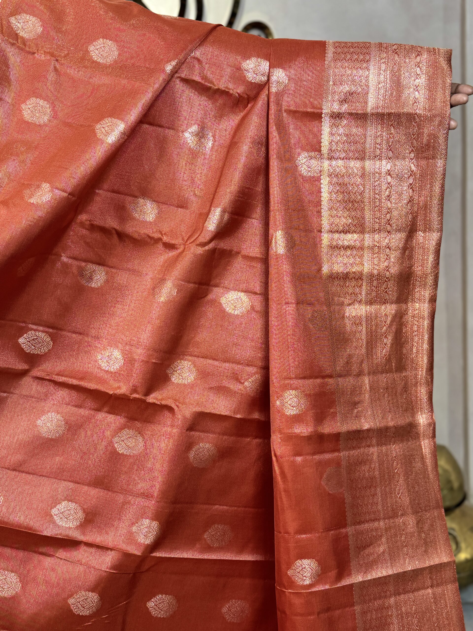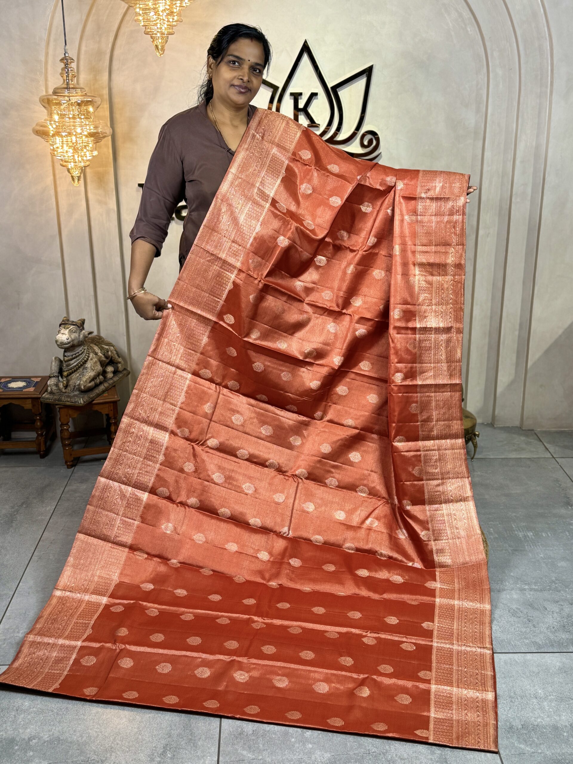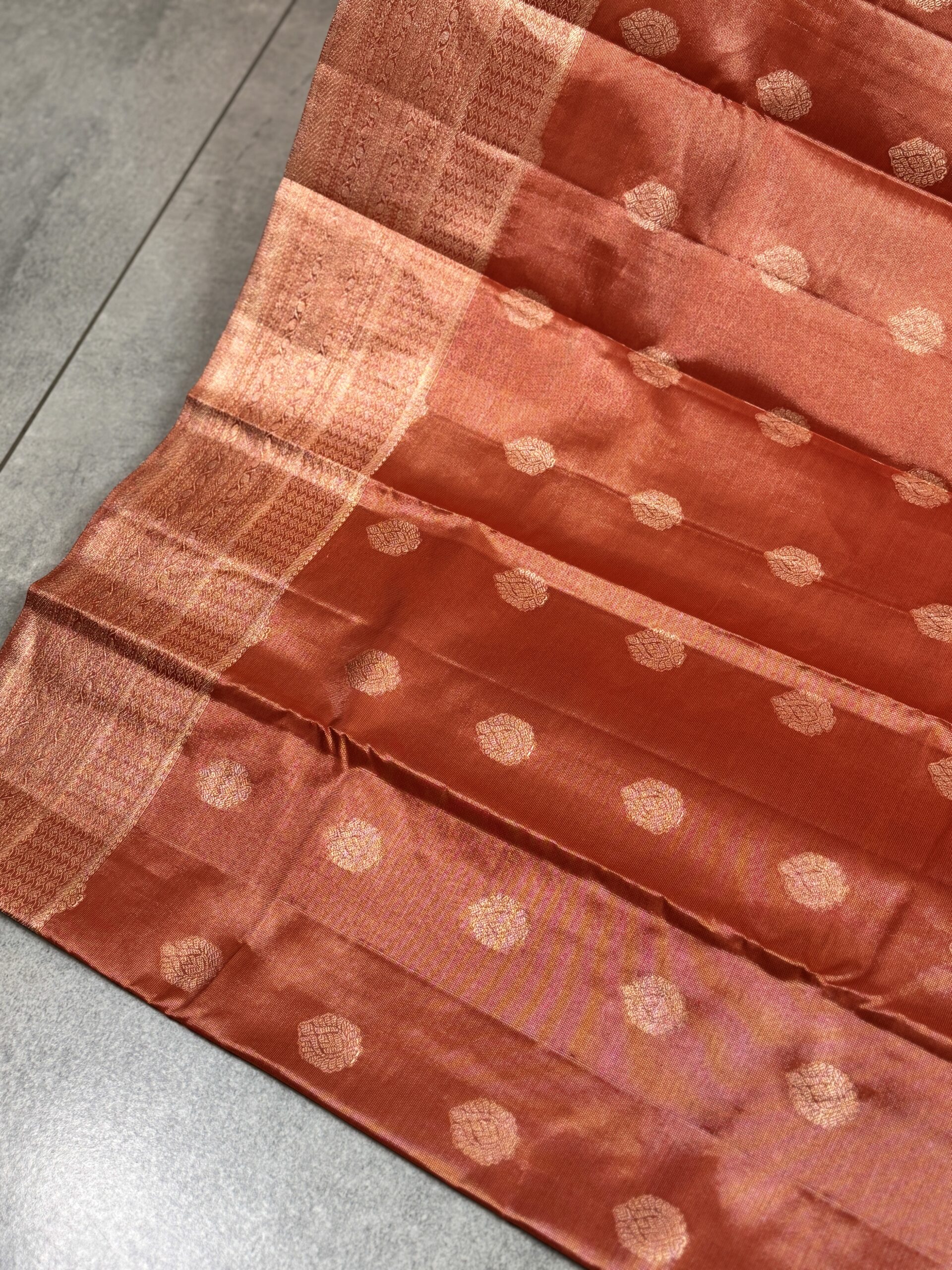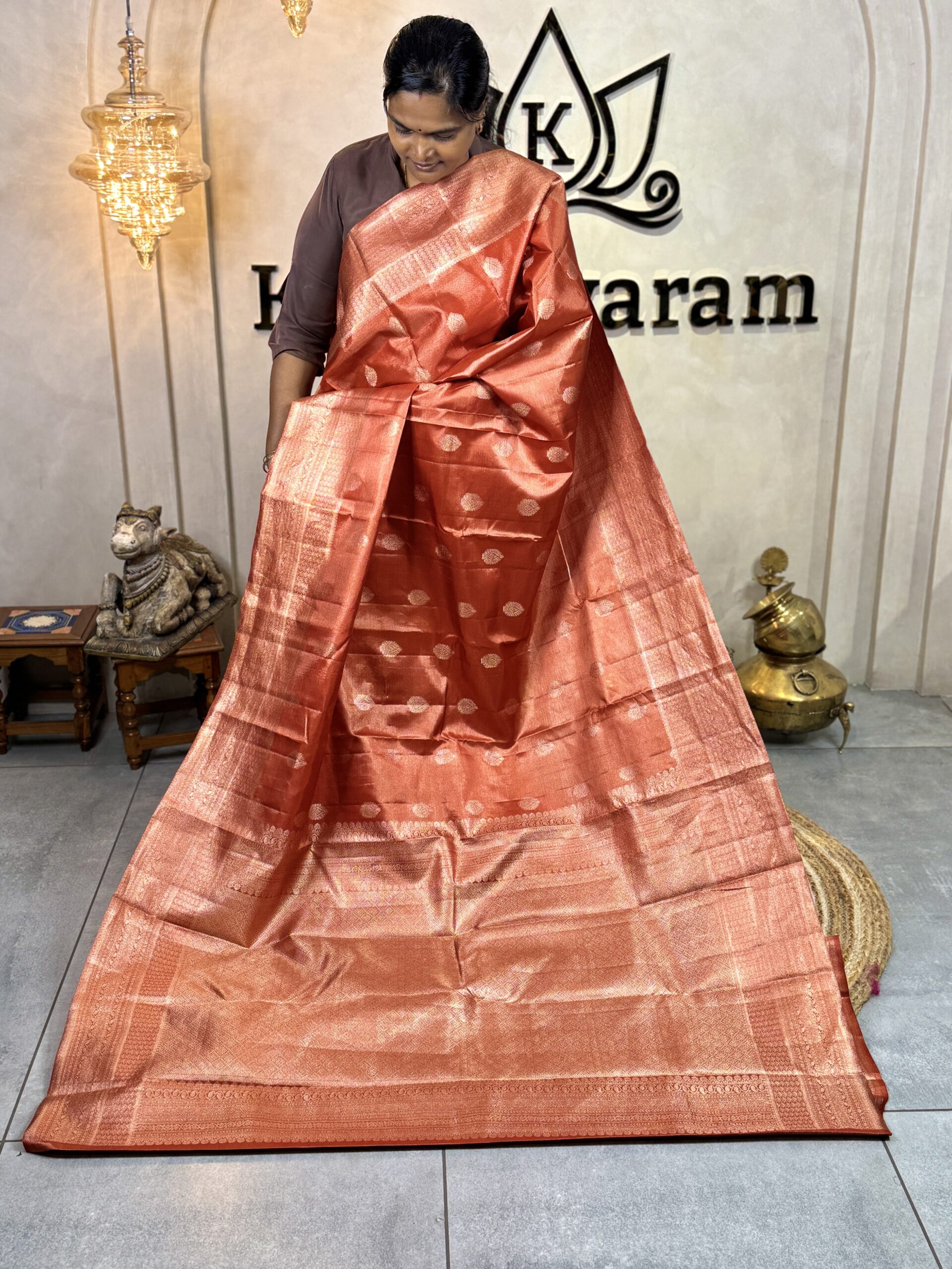 This pure Kanchipuram silk saree comes in a rich burnt orange tone with warm coppery undertones, fully woven in luminous platinum zari that lends the silk a refined, graceful shimmer. The body is intricately woven with fine, continuous Vaira-Oosi-style zari lines, creating beautiful depth and texture across the saree. Complementing this are small-sized, stylised leaf bootas woven evenly in platinum zari, adding subtle detailing while maintaining visual balance.
