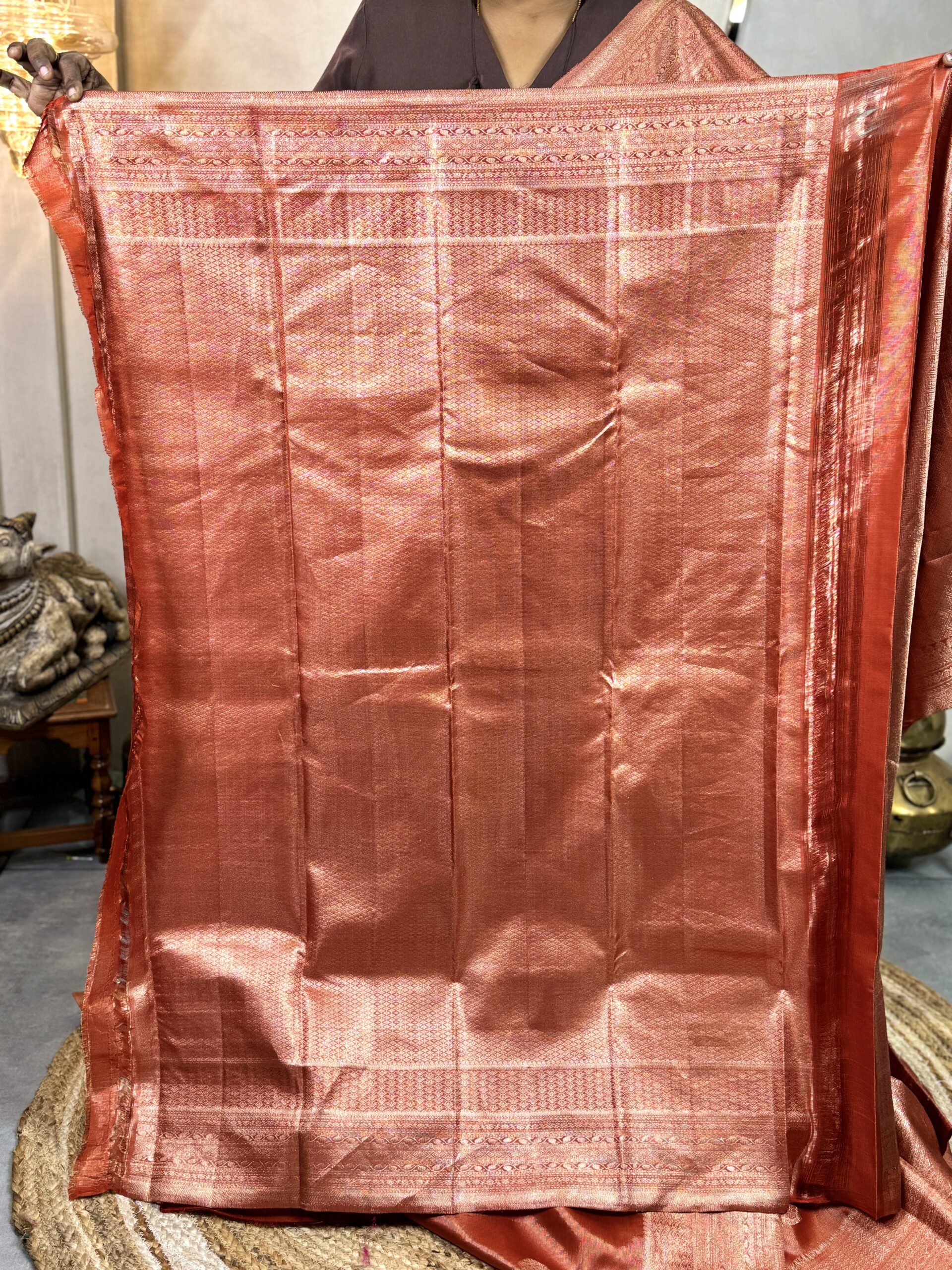 Burnt Orange Kanchipuram Silk Saree, Platinum Zari Brocade