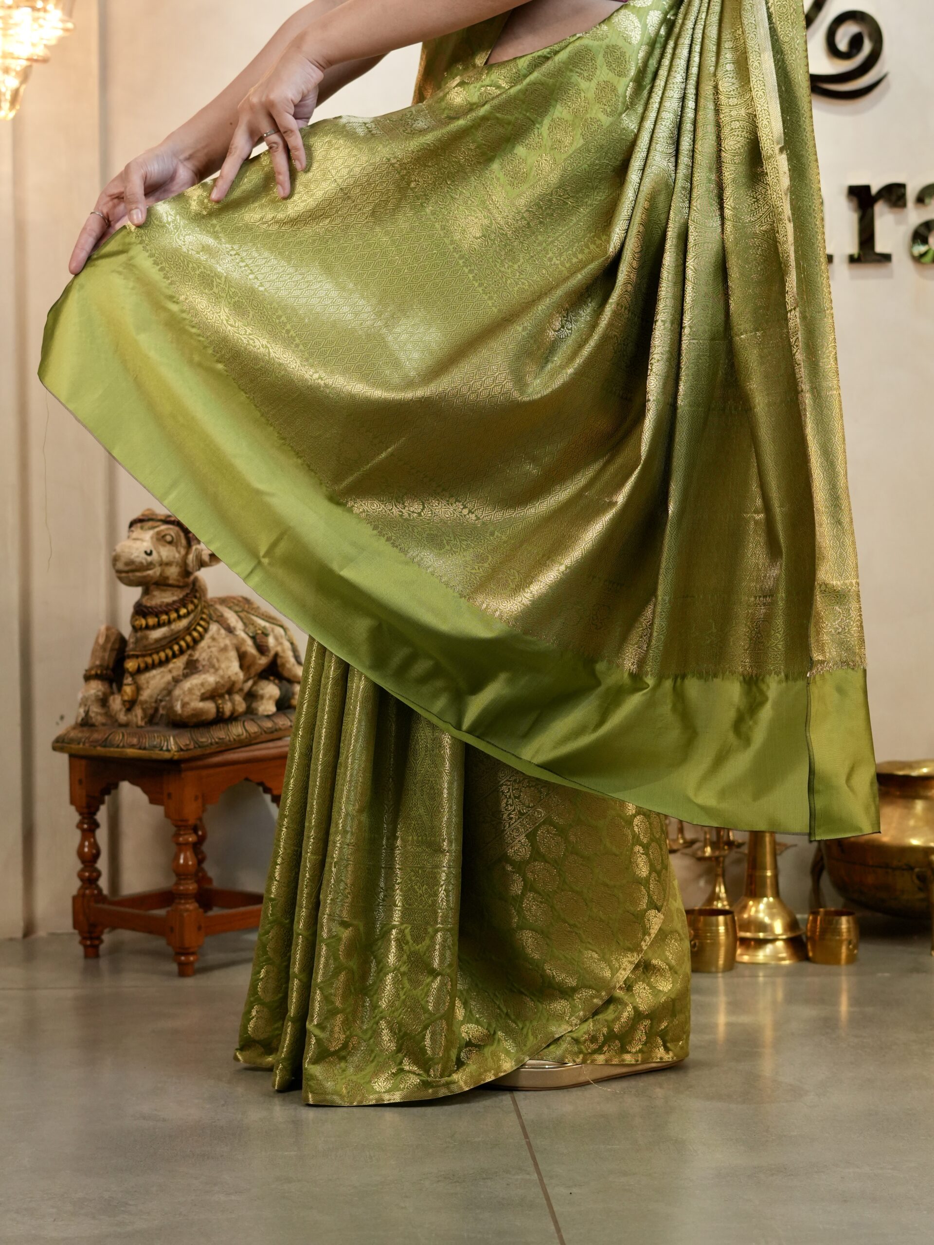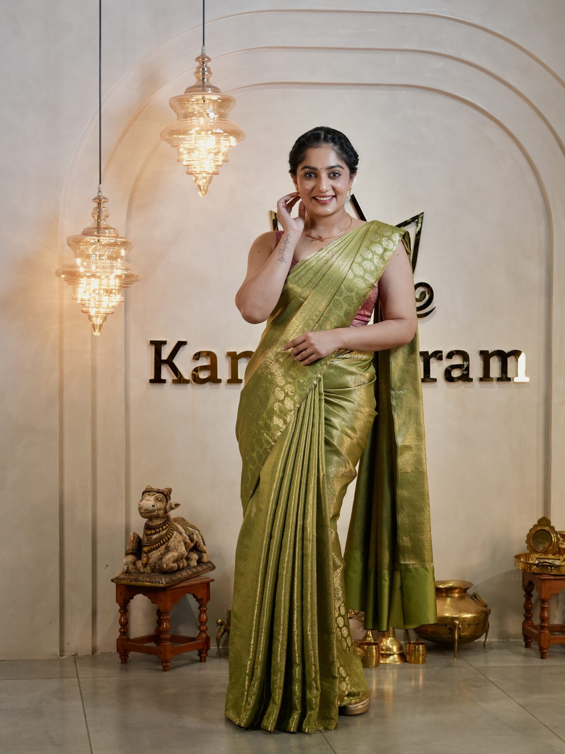 This semi silk saree comes in a rich green tone with an all-over zari weave that covers the body, borders, pallu, and blouse piece. The fabric has a beautiful shimmer and a smooth, effortless drape that gives a grand look without any heaviness. The patterns add richness and detailing, making this saree perfect for weddings, receptions, and festive occasions. Though it is a semi-silk saree, it looks far more premium than its price and offers a graceful, body-hugging silhouette when worn.