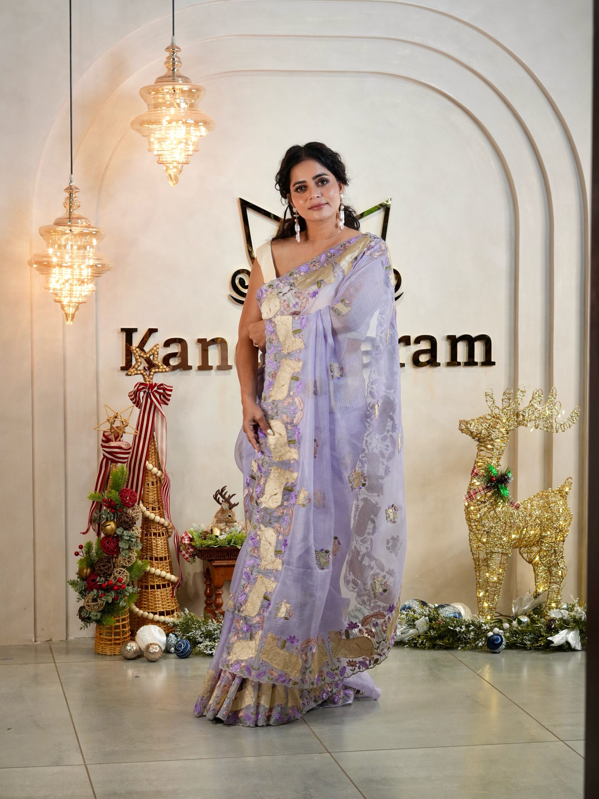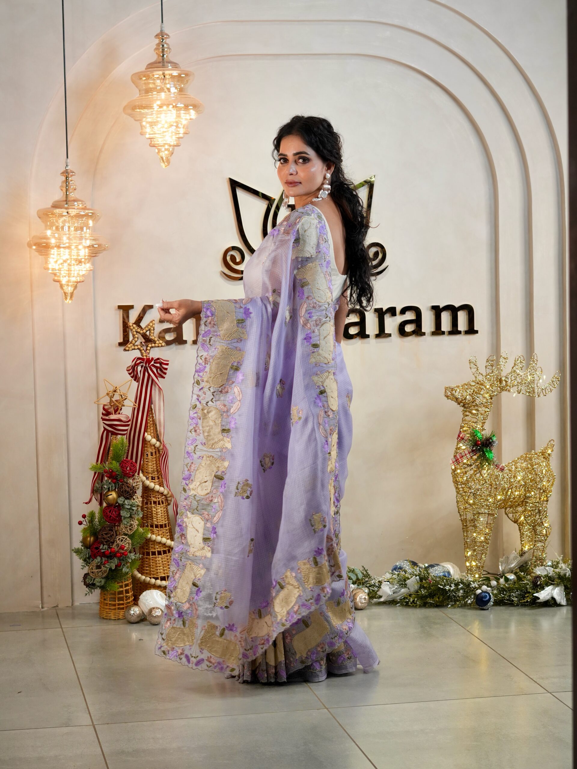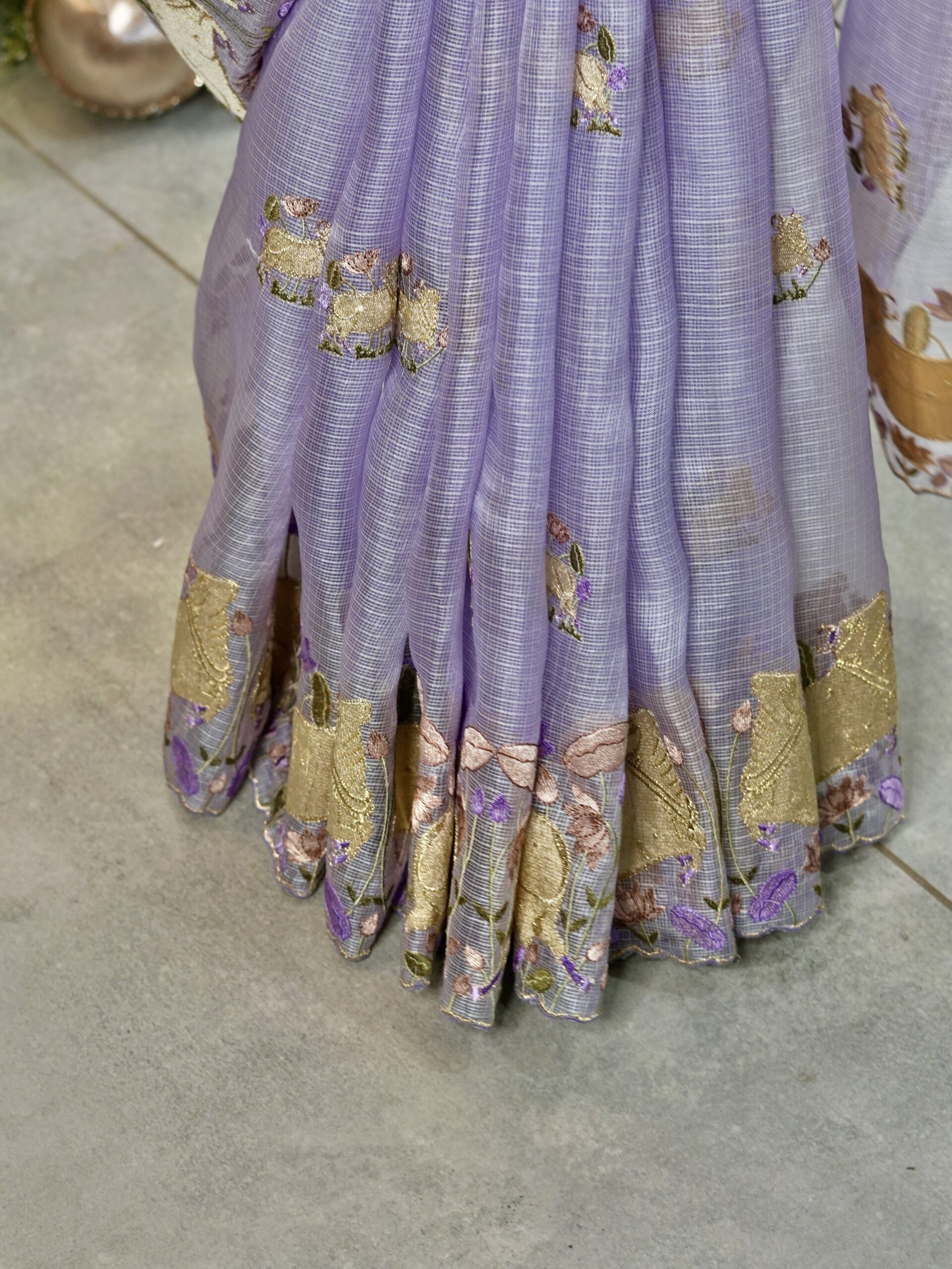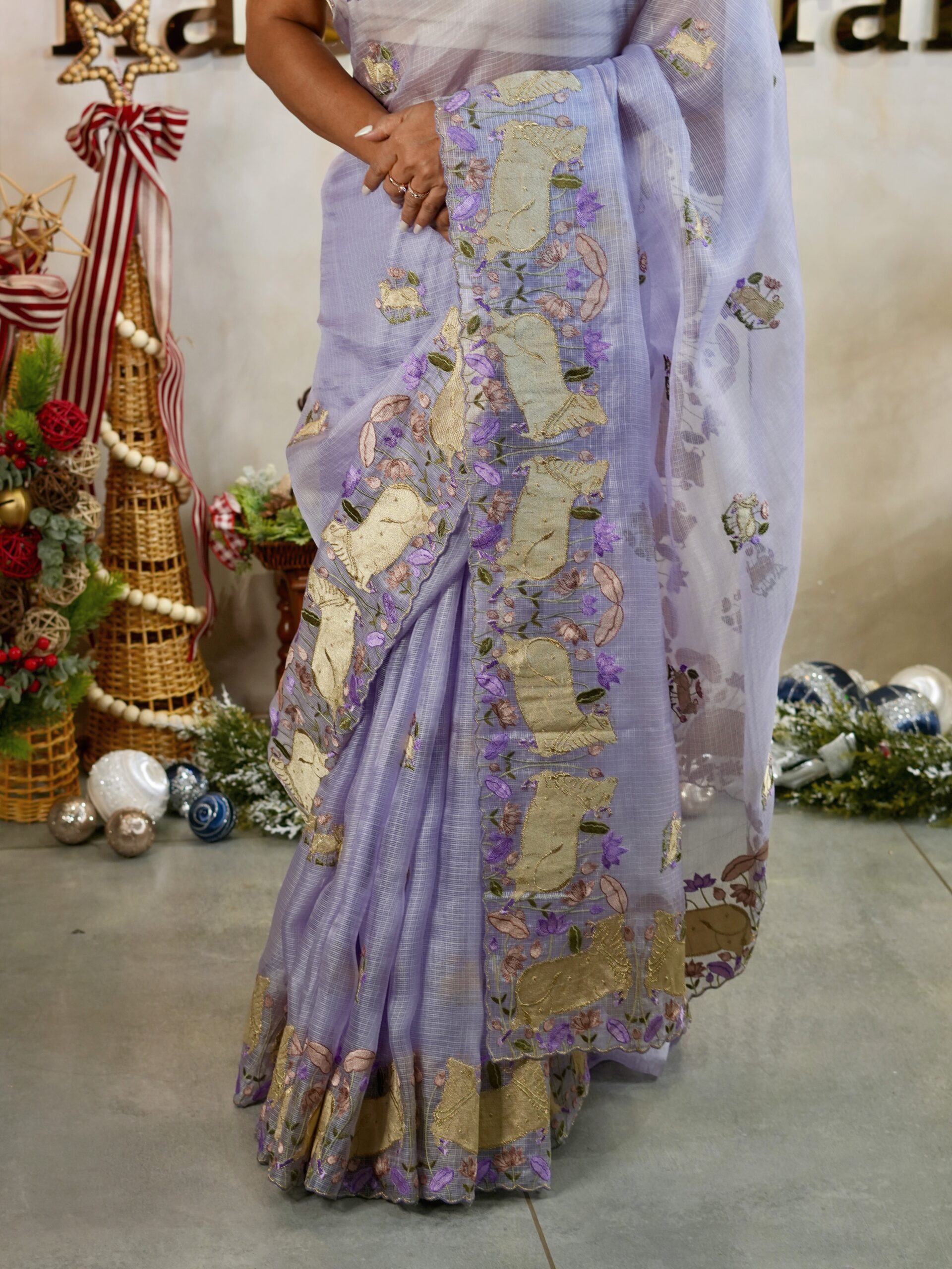 The borders showcase embroidered Pichwai cows in a soft gold tone, surrounded by delicate floral motifs — adding texture, colour, and storytelling to the drape. The body of the saree is adorned with small scattered Pichwai embroidery motifs, giving it a balanced and graceful look without overwhelming the fabric.