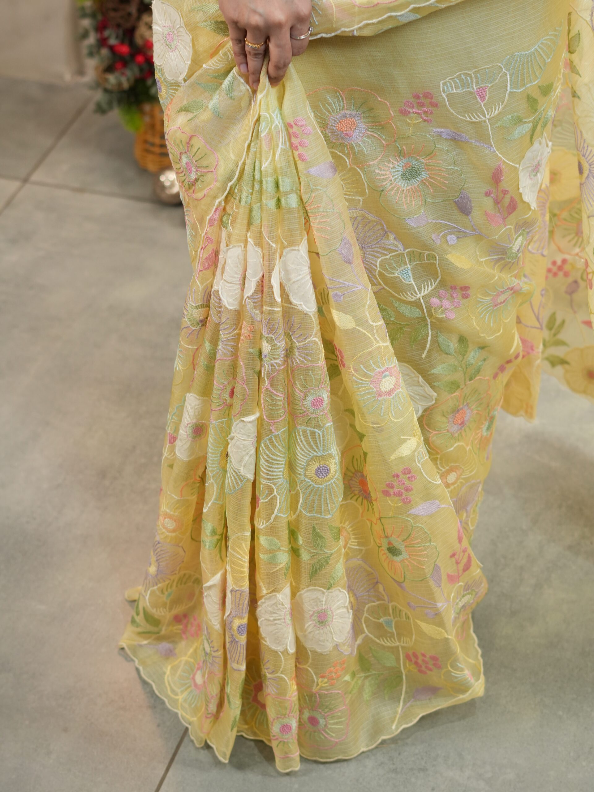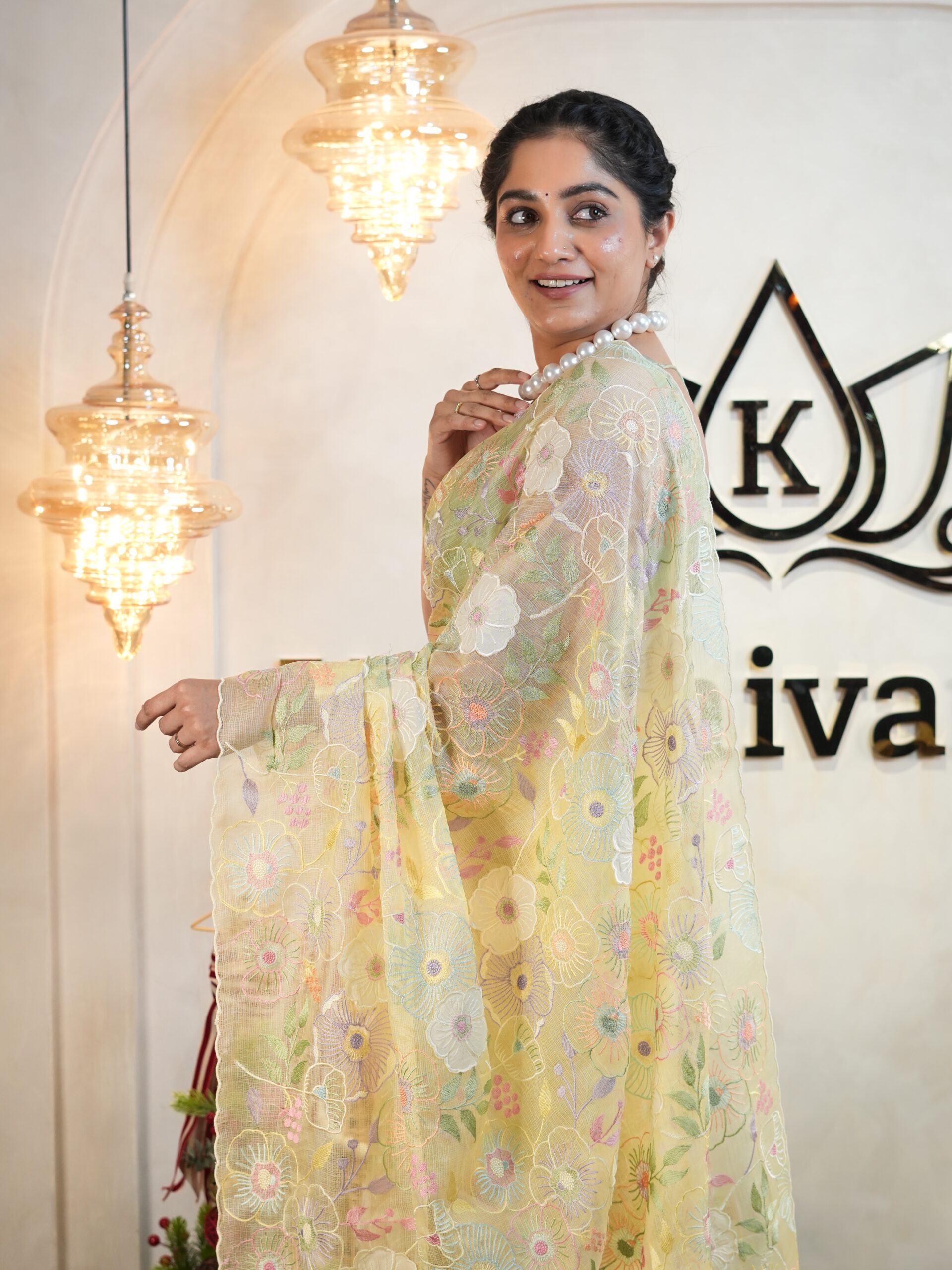 These Pure Kota Silk sarees feature intricate floral embroidery spread beautifully across the body, giving each piece a soft, romantic finish. The texture is airy and effortless, making it a perfect choice for occasion wear and the holiday season.
