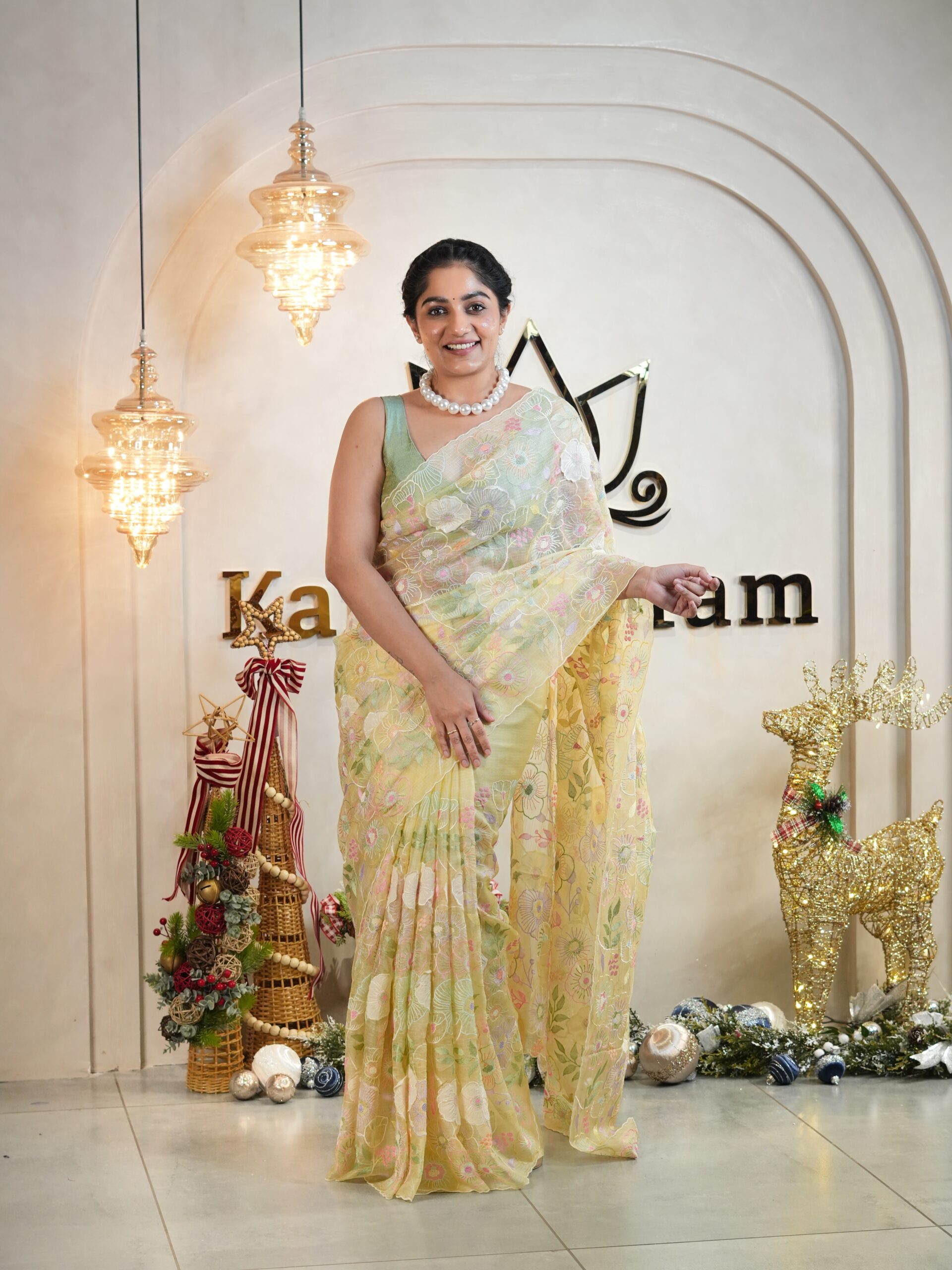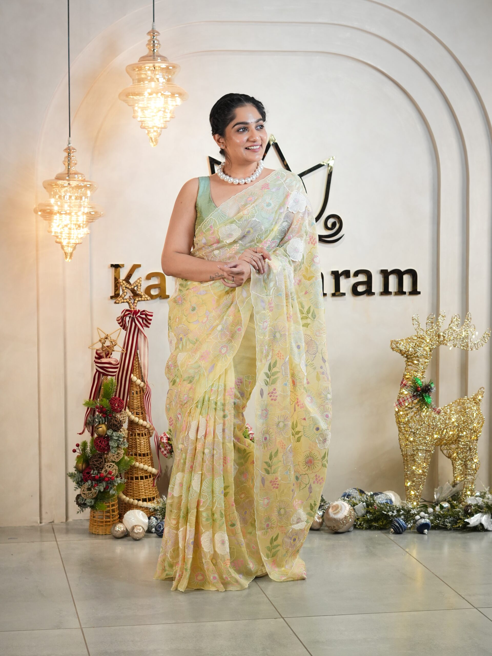 Presented in soft pastel tones, the collection includes four elegant colours, each paired with a matching blouse piece to complete the look. The saree flows gracefully, with its embroidery adding just the right touch of detail without overwhelming the drape.