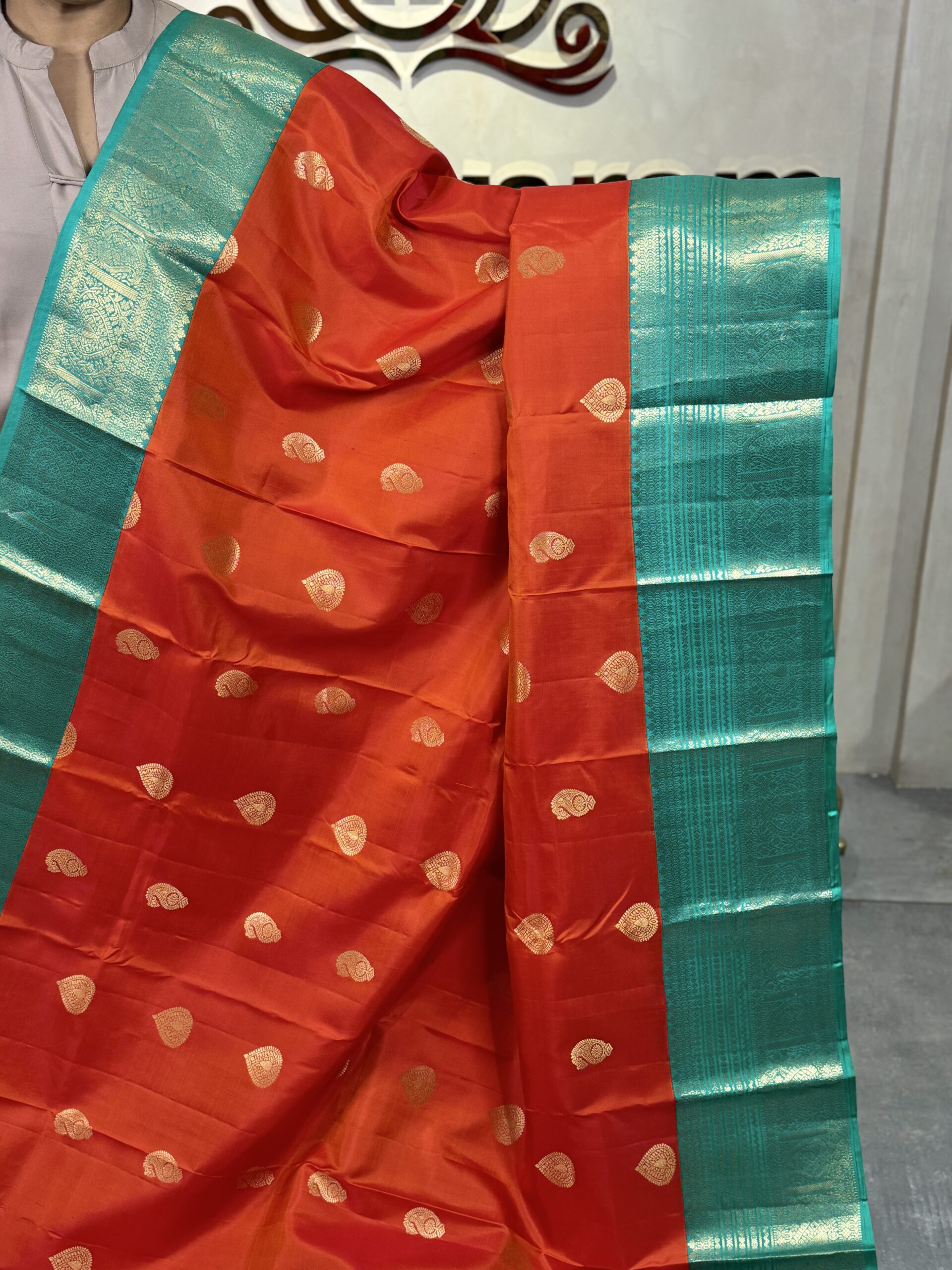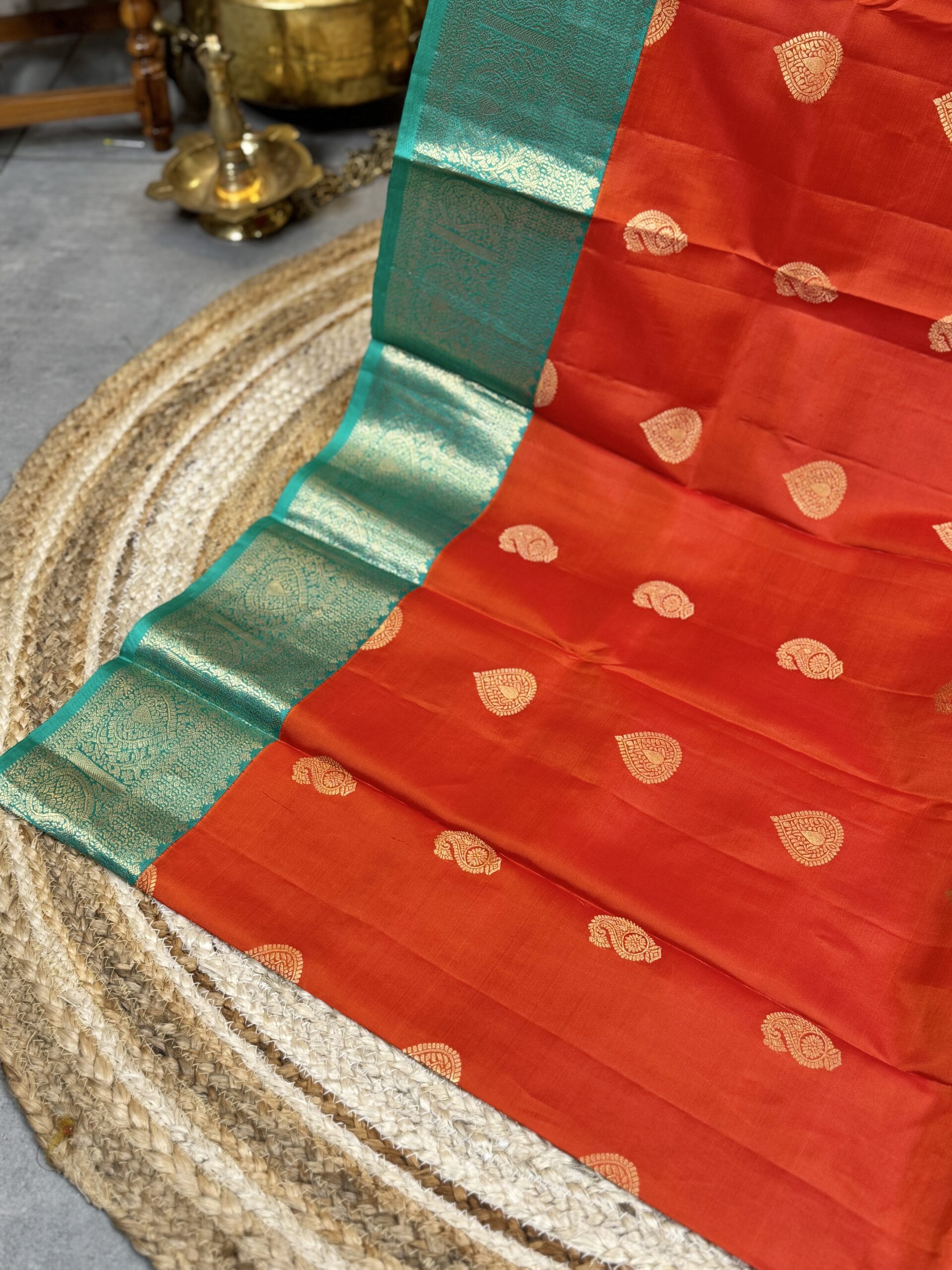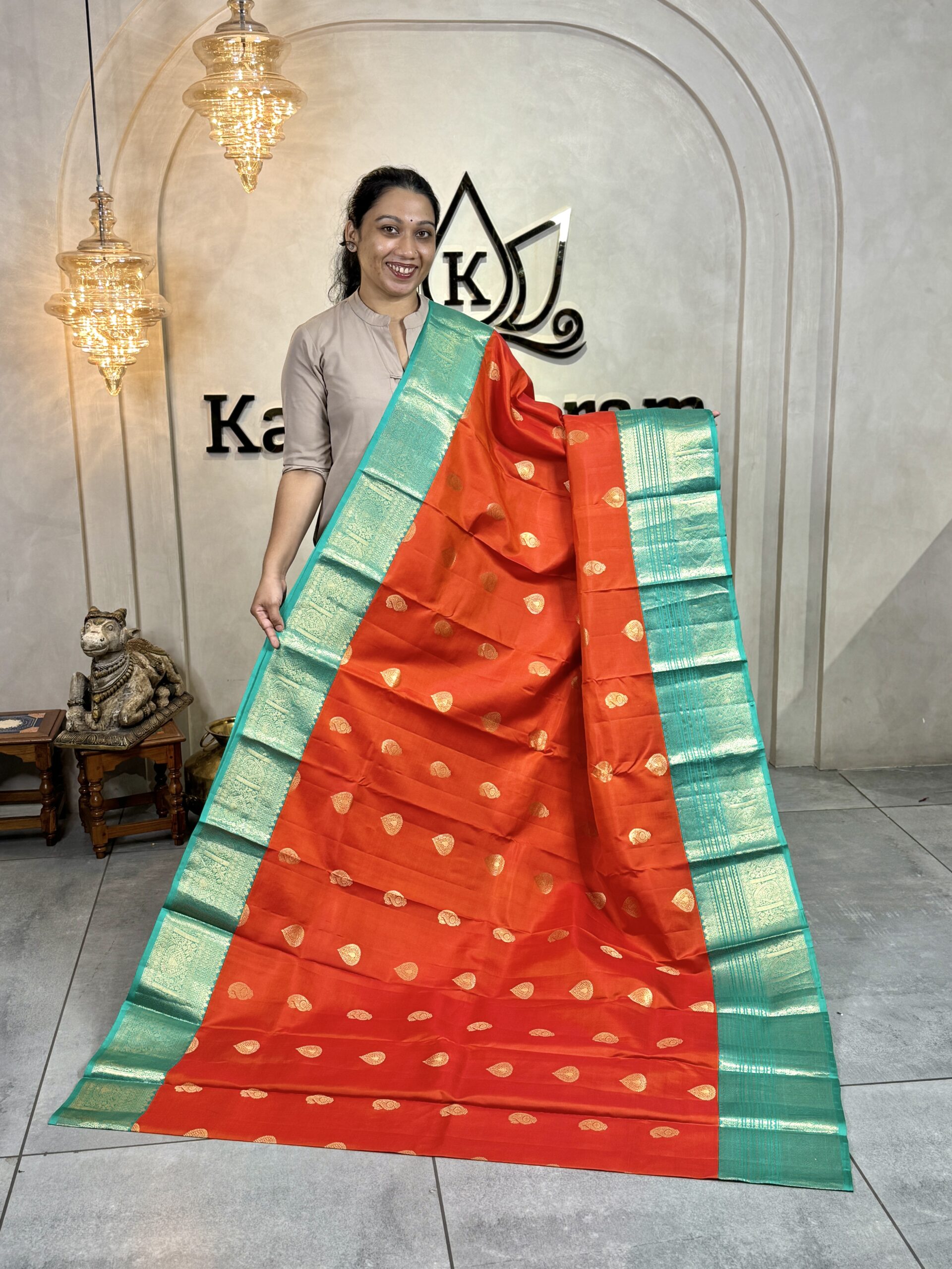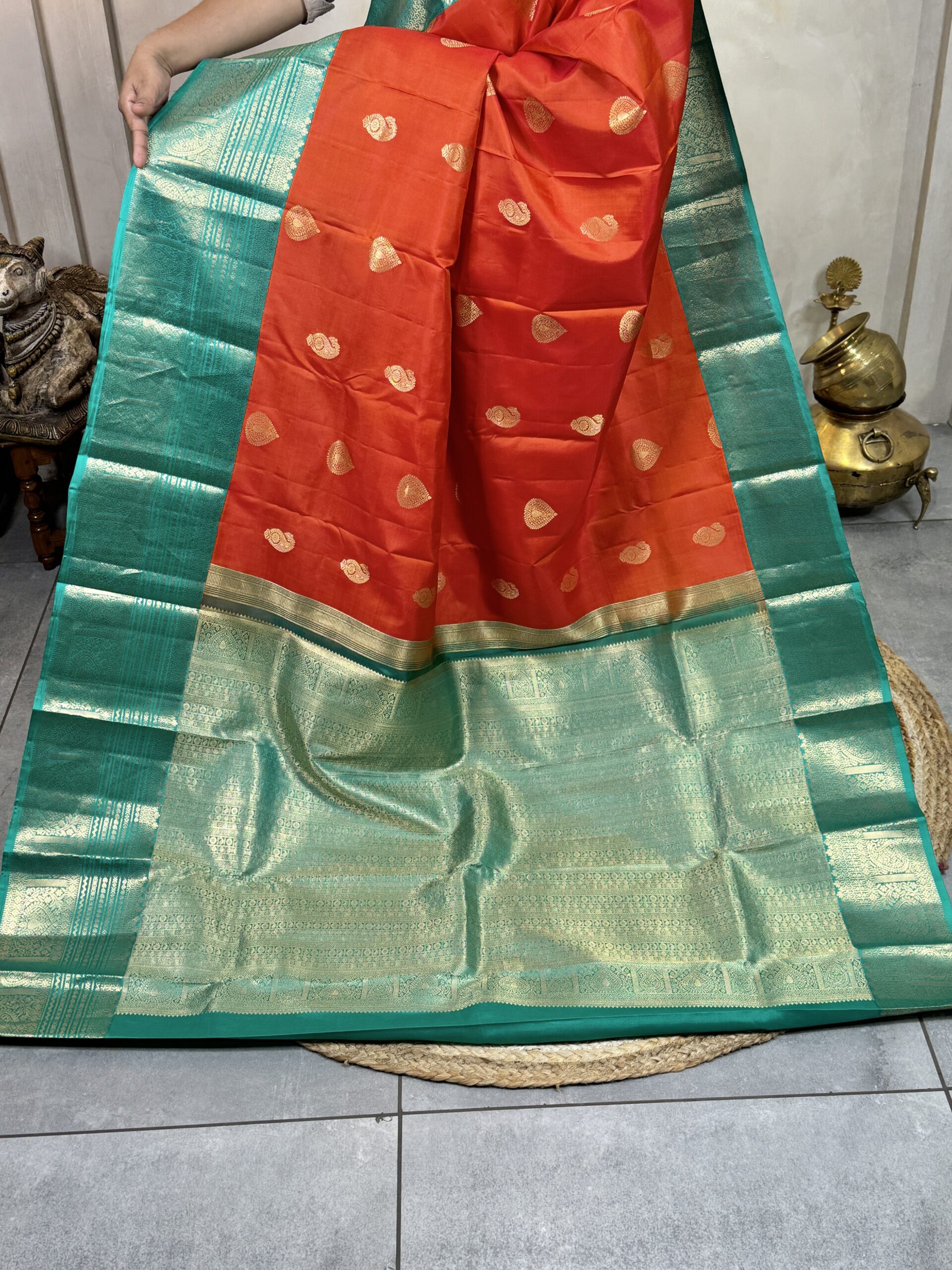 Pure Kanchipuram Silk Saree in Bright Orange with Peacock Green Border