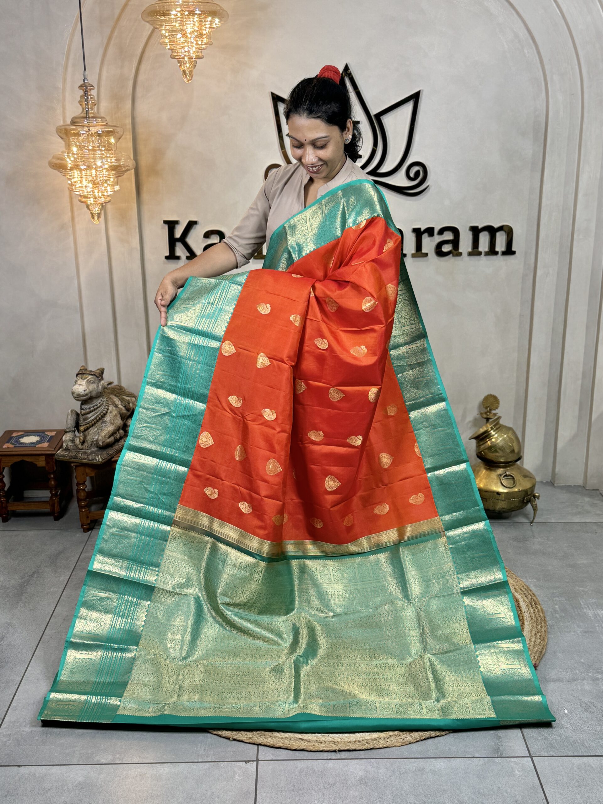 This pure Kanchipuram silk saree is woven in a vibrant bright orange tone, a lively and auspicious colour that brings instant warmth and presence to the drape. The body is richly detailed with gold zari-woven butas arranged in vertical rows, alternating between classic paisley motifs and stylised leaf-shaped butas, creating a structured and visually striking pattern across the saree.