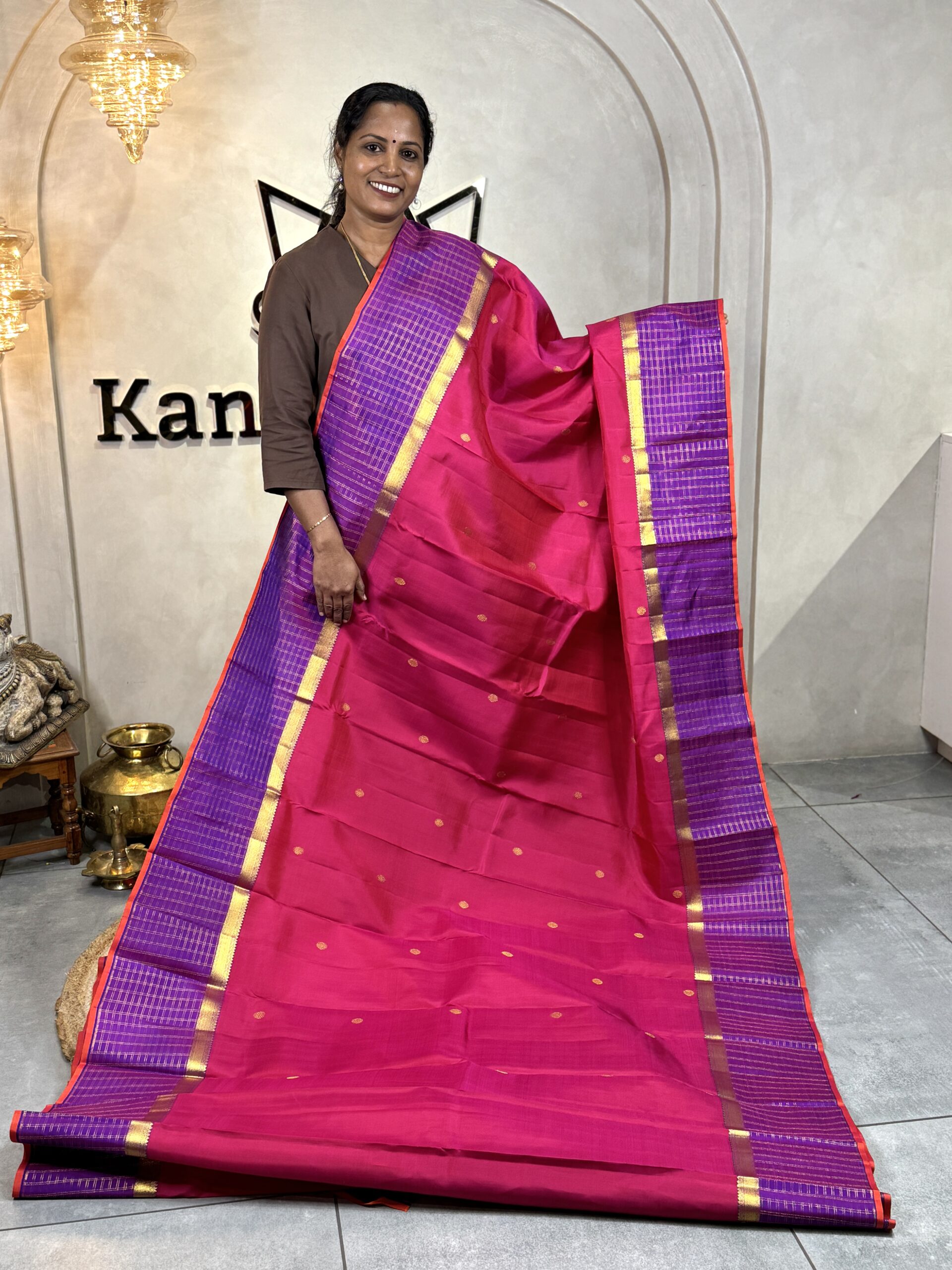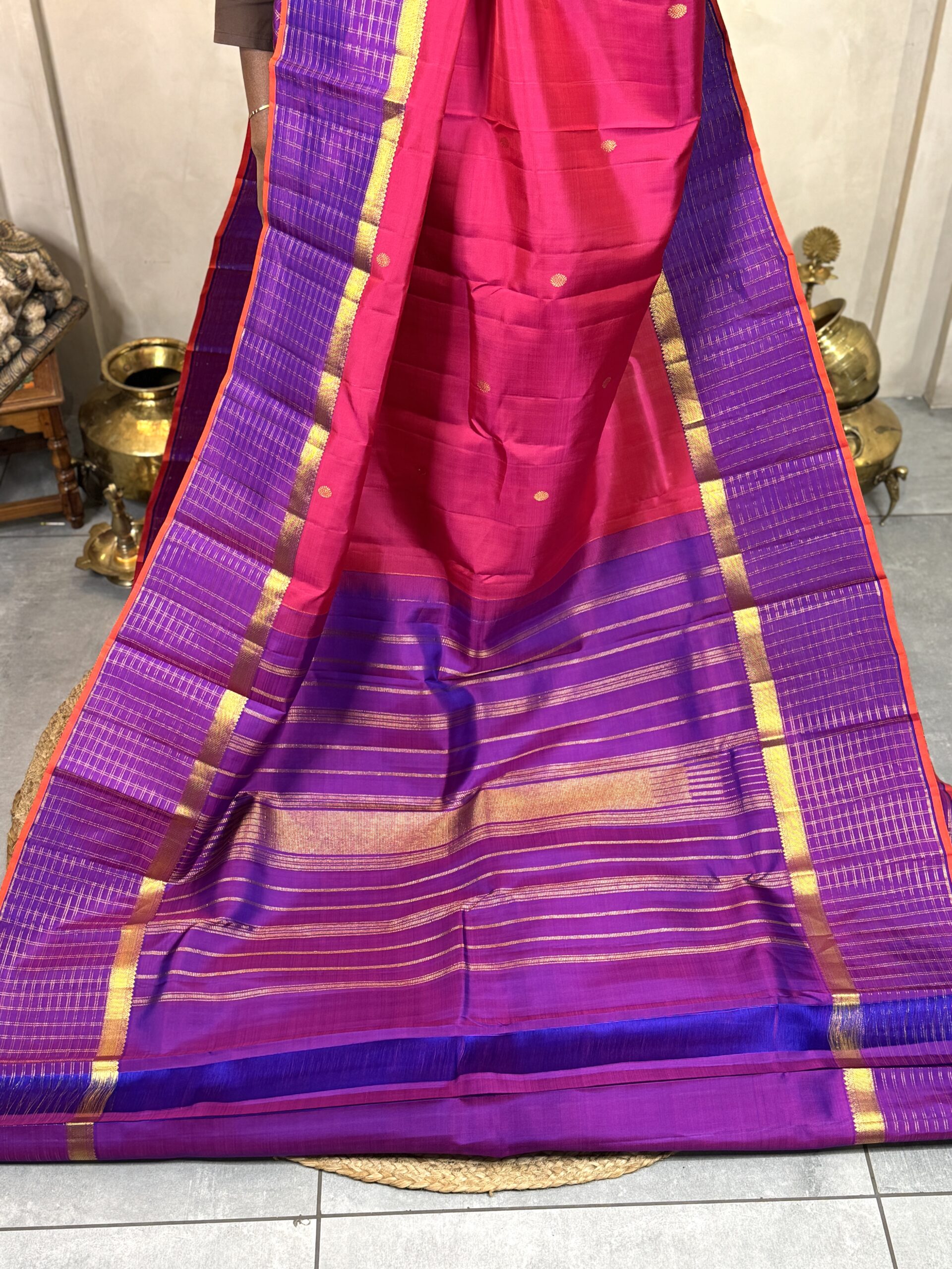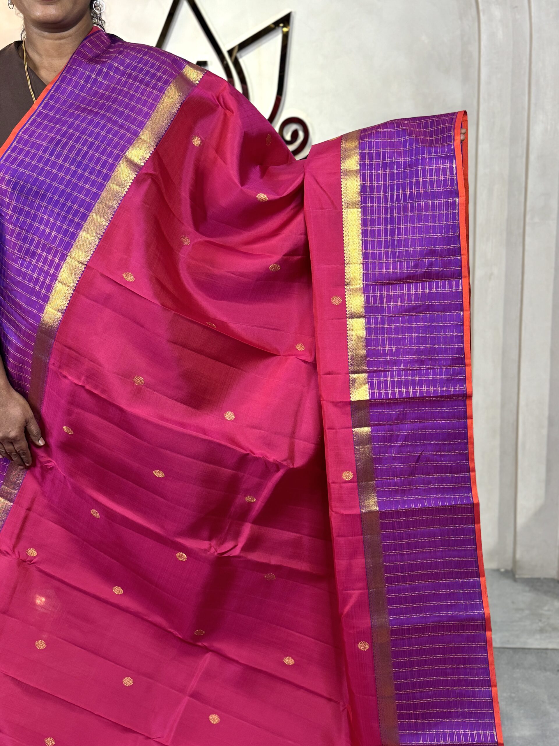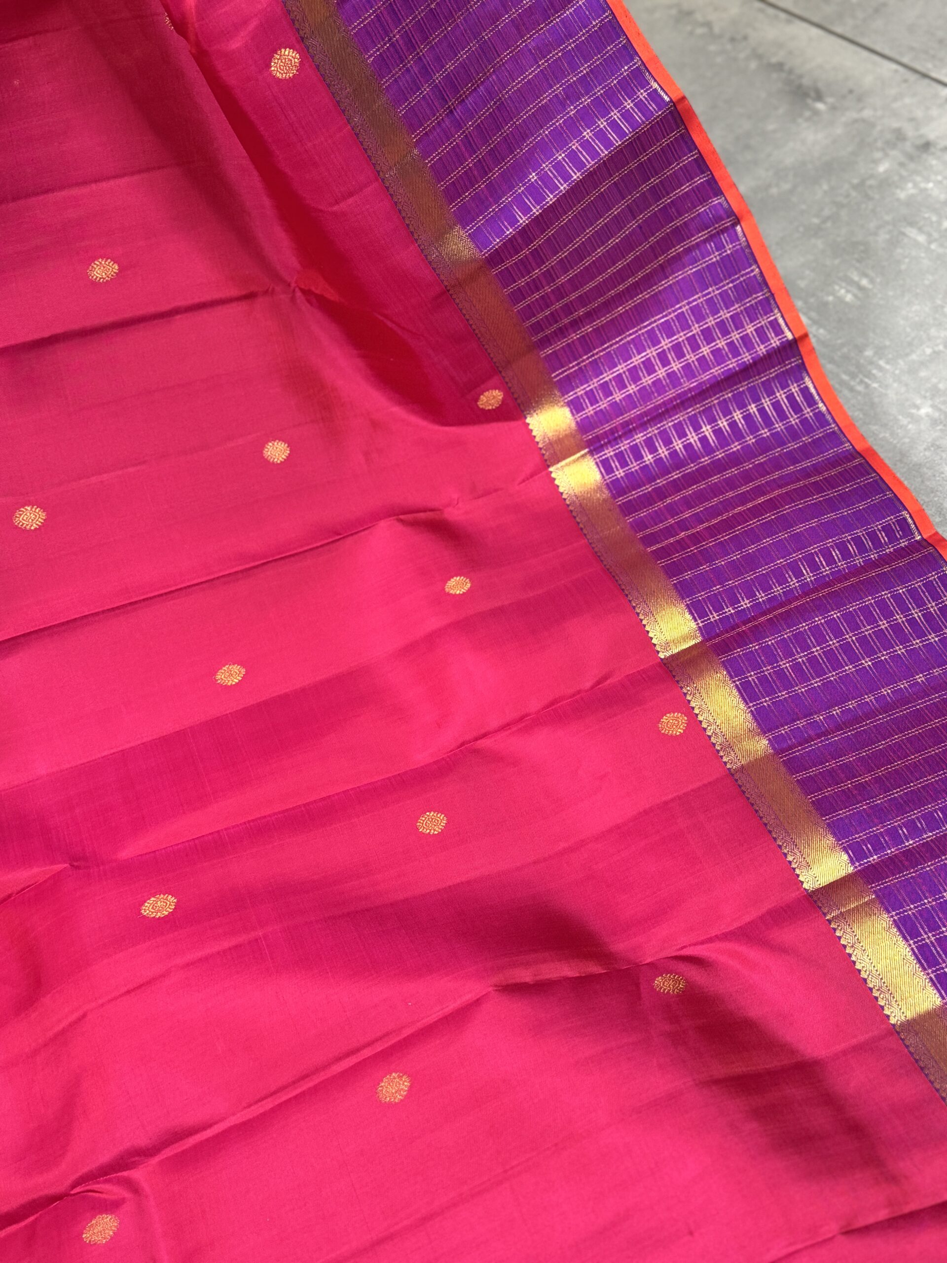 This pure Kanchipuram silk saree comes in a striking bright pink body, a vivid and festive shade that brings instant vibrance to the drape. The body is subtly detailed with small gold zari round butas scattered evenly across the fabric, adding richness while keeping the look clean and balanced.