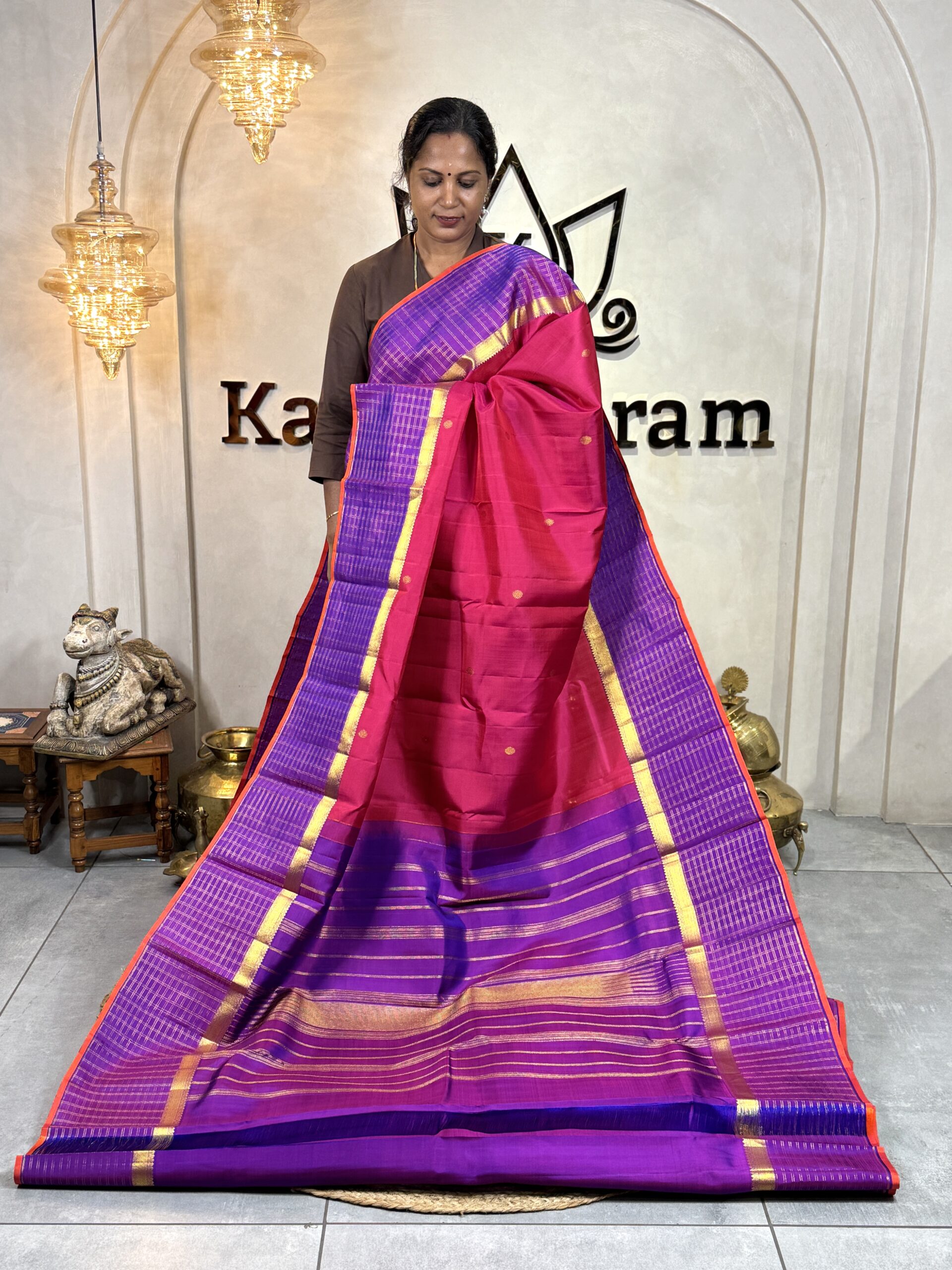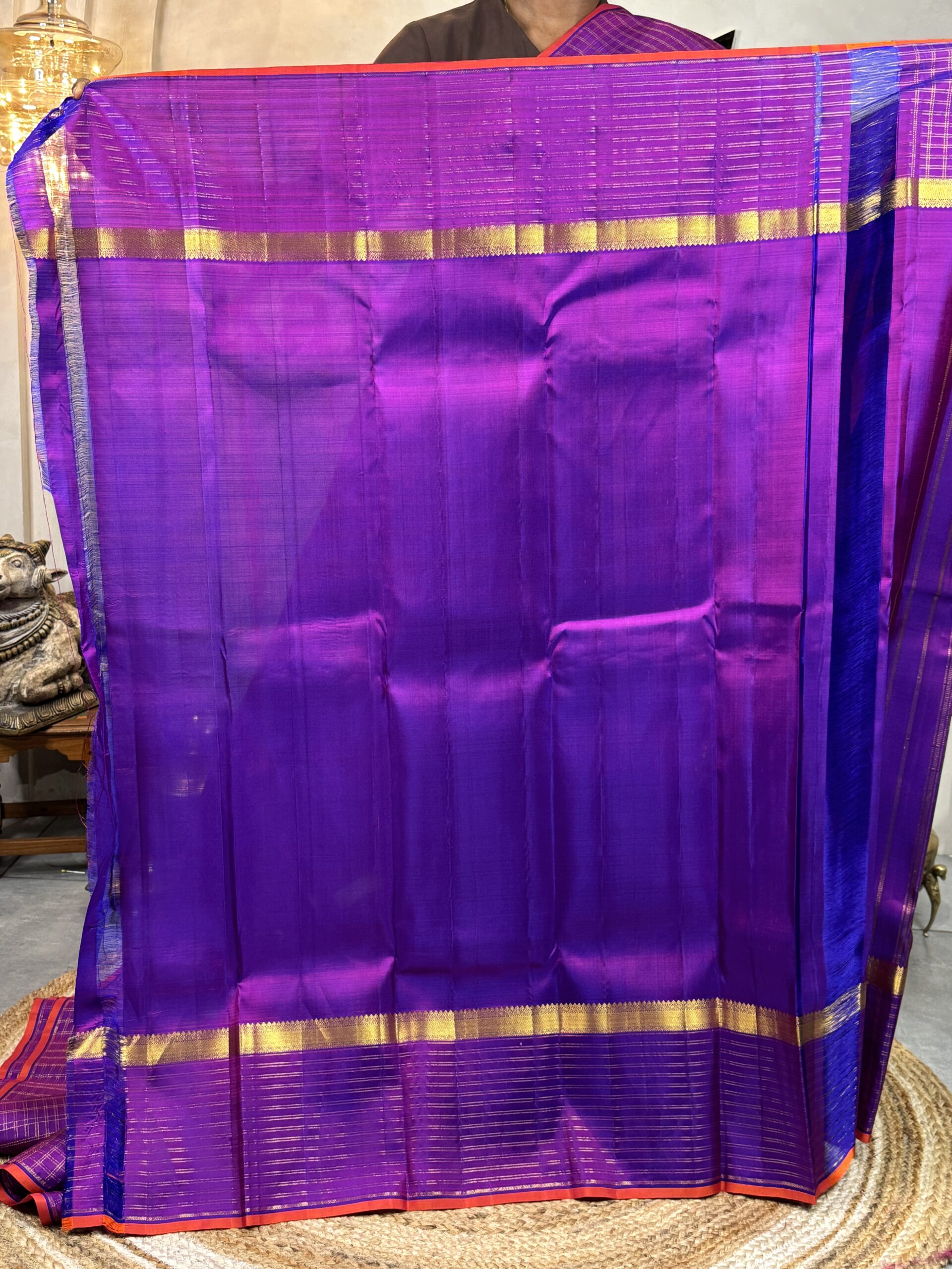 The saree is framed with a bold royal purple contrast border, woven in a classic checked pattern using gold zari, giving it a strong and distinctive Kanchipuram identity. Running along the length of the saree is a Bright Orange Selvedge, adding a sharp traditional accent and a beautiful pop of contrast.
