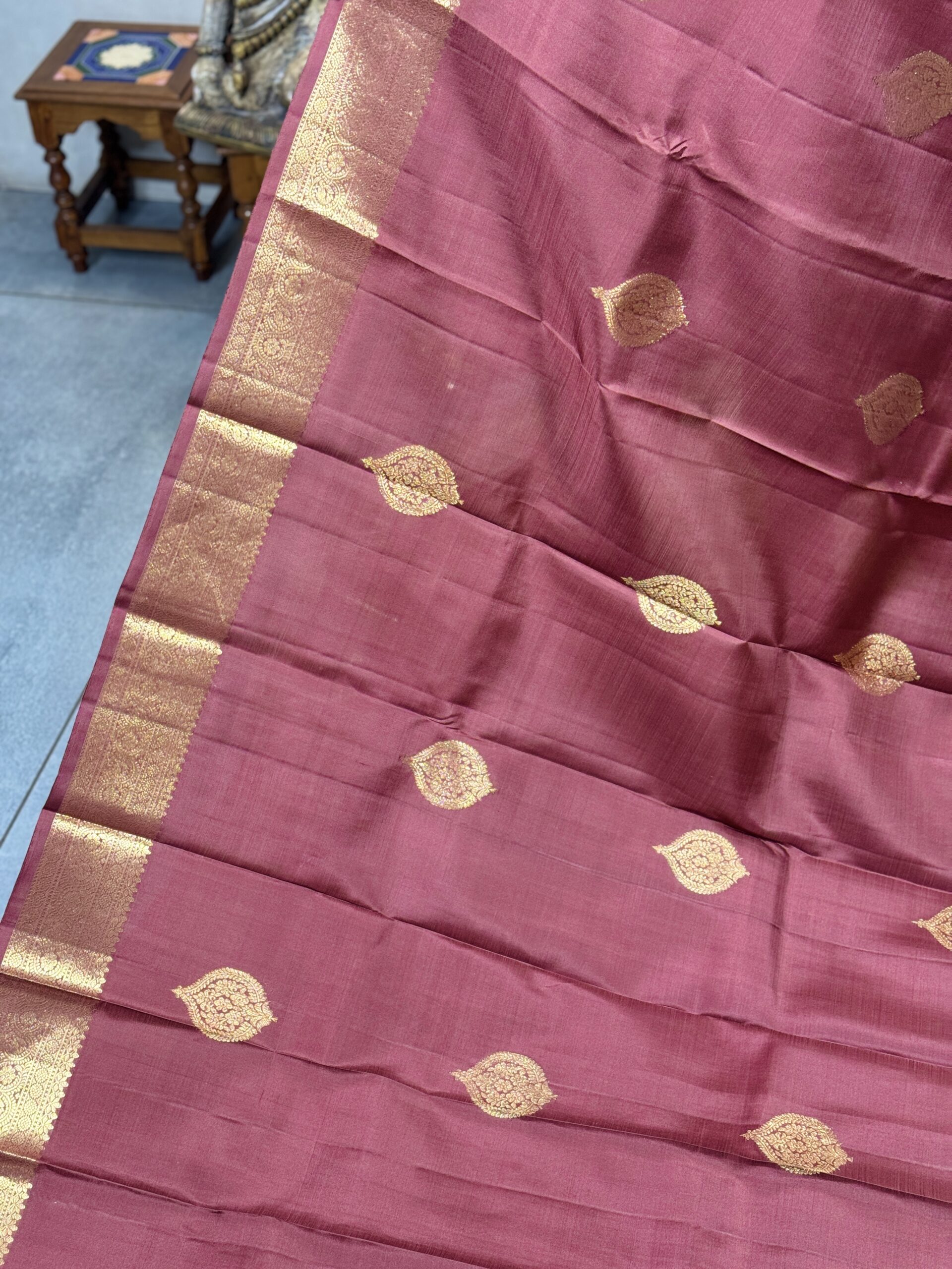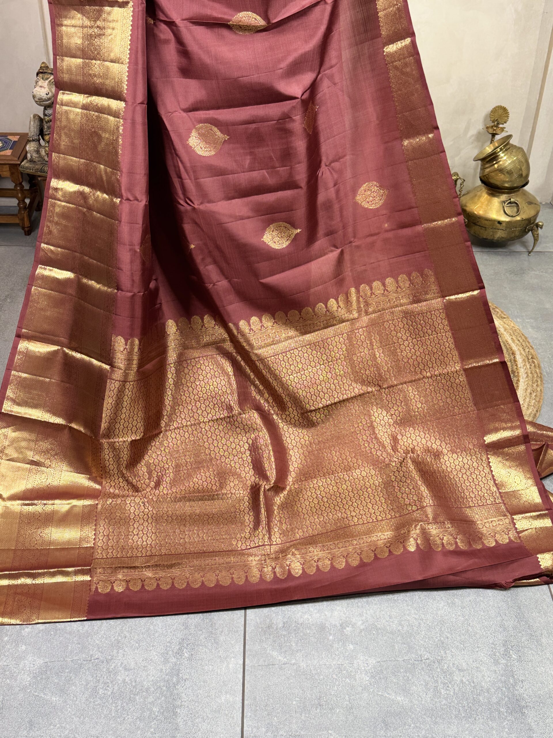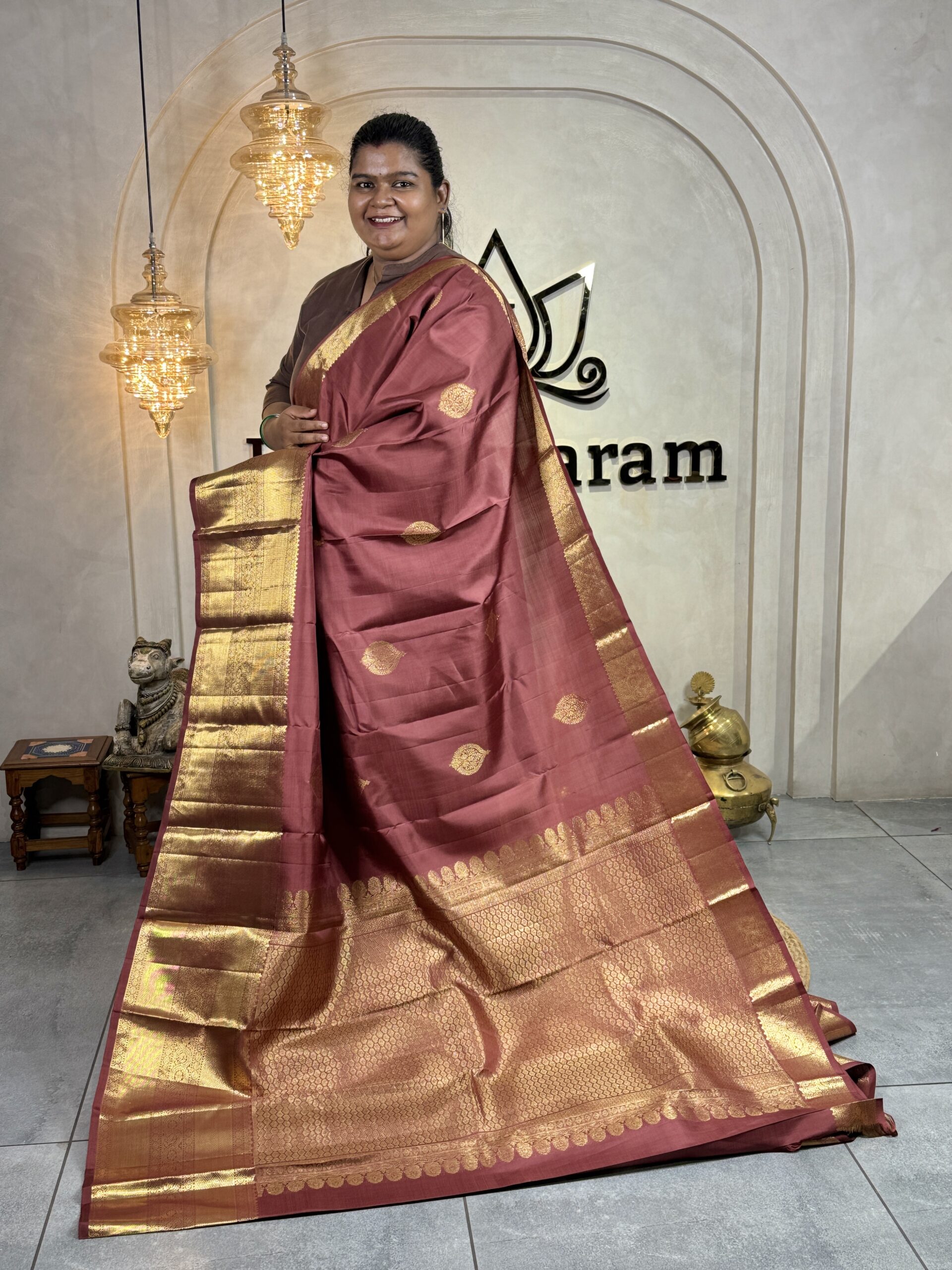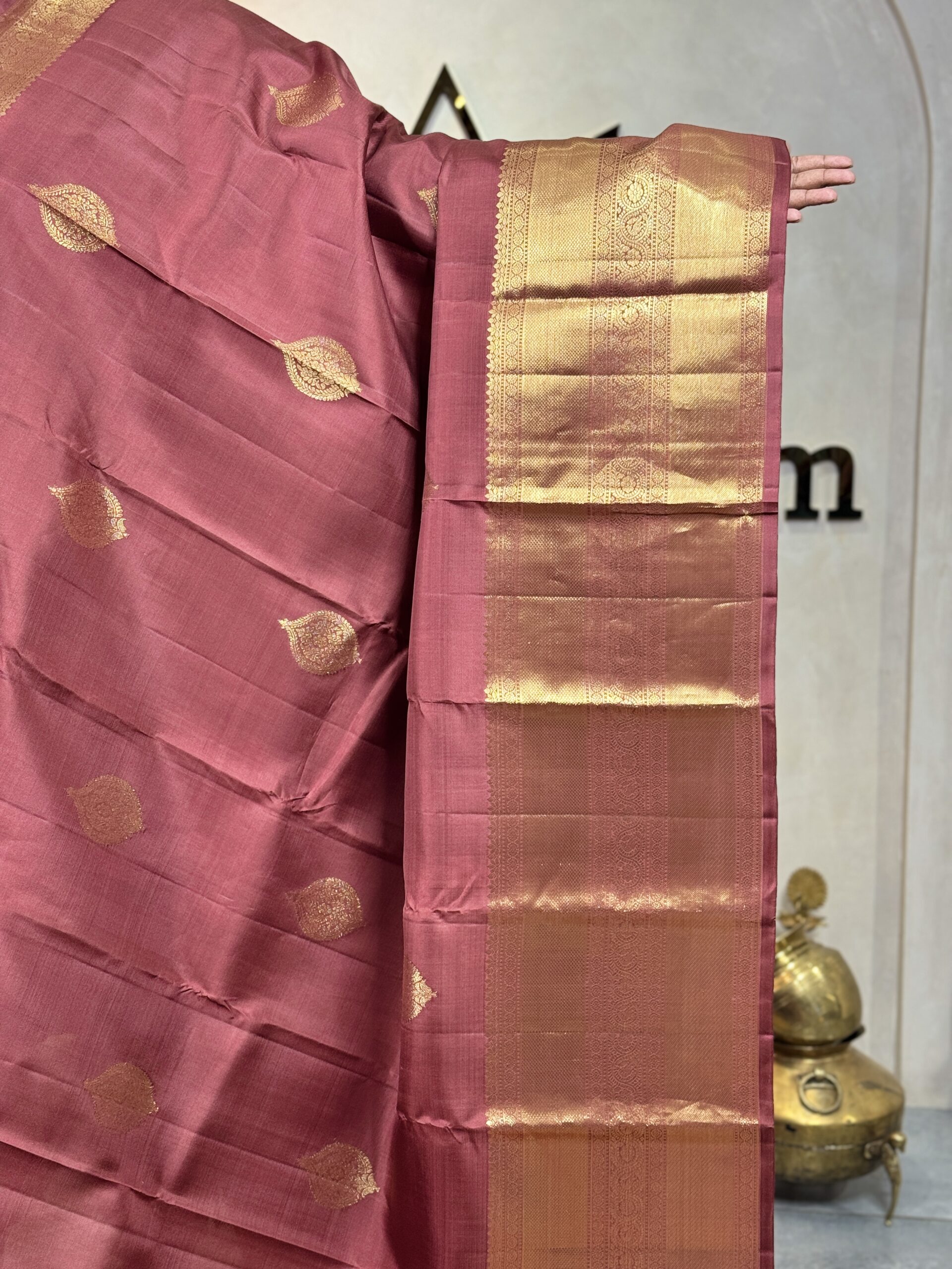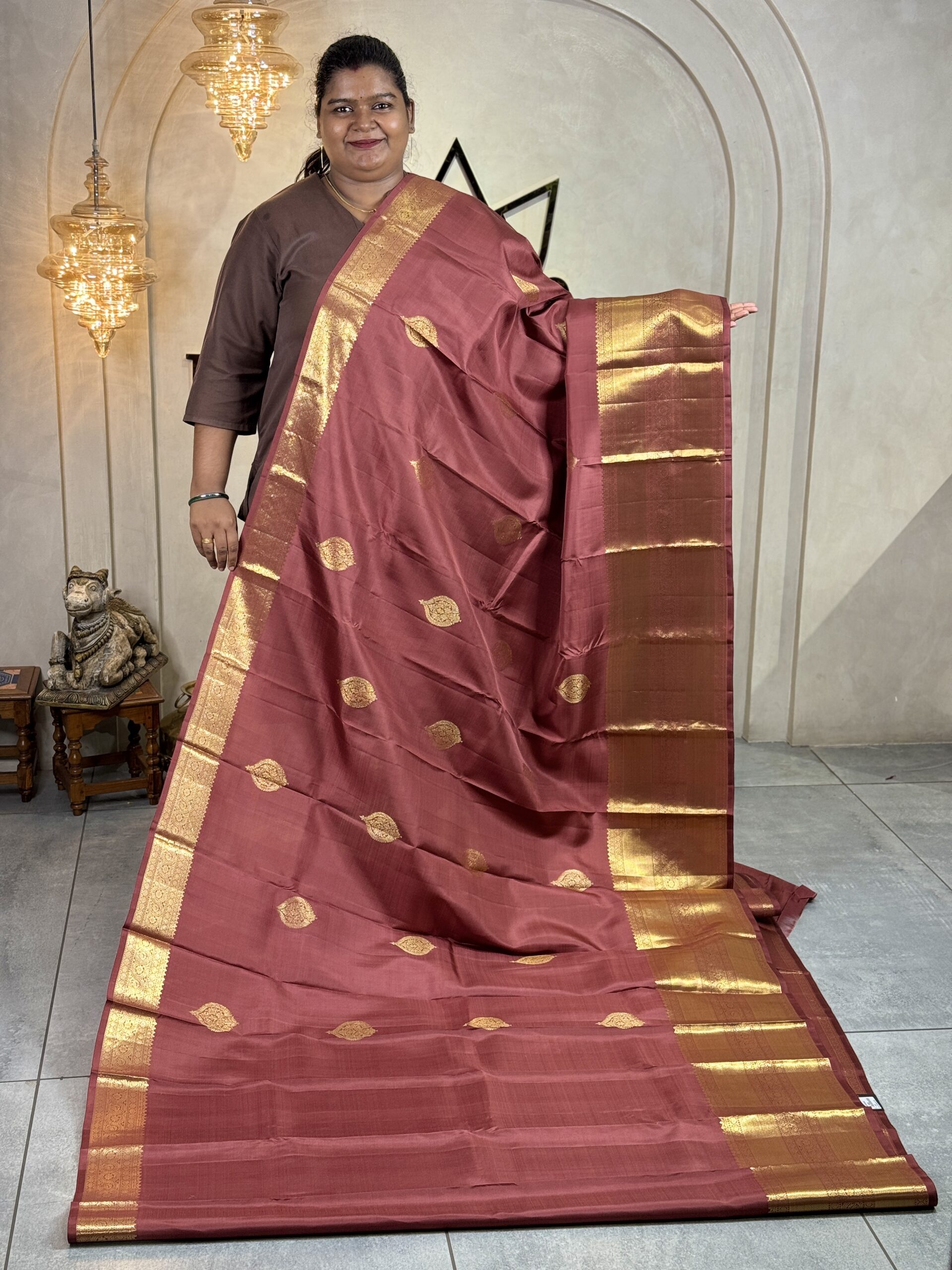 This pure Kanchipuram silk saree is woven in a rich muted brick red tone, a warm and earthy shade that brings out the beauty of traditional gold zari weaving. The body of the saree is fully woven in gold zari, featuring medium-sized paisley bootas scattered evenly across the fabric, adding depth and classic charm to the drape.