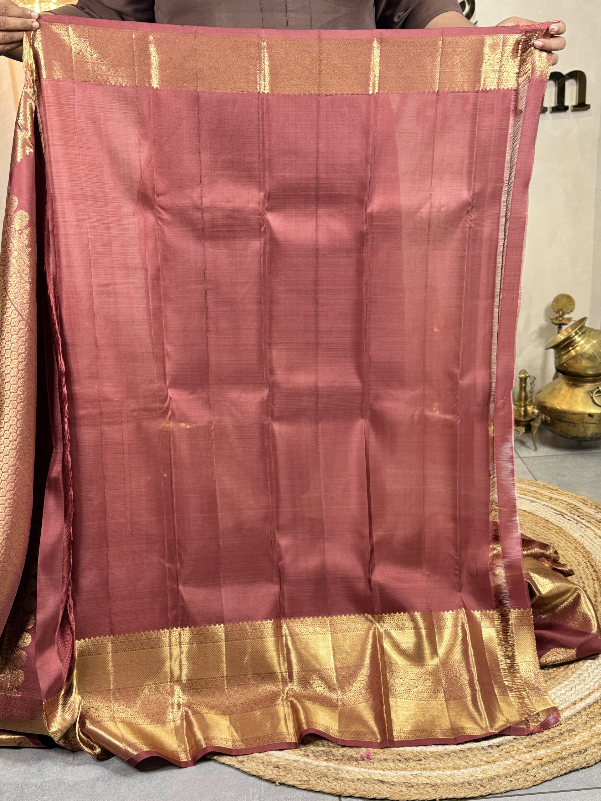 The saree is framed with finely crafted gold zari-woven borders, giving it a strong and timeless Kanchipuram identity. The pallu is grandly woven in gold zari with traditional detailing, offering a striking finish that enhances the overall richness of the saree. The blouse piece comes in the same muted brick red shade with matching zari borders, ensuring a cohesive and polished look.