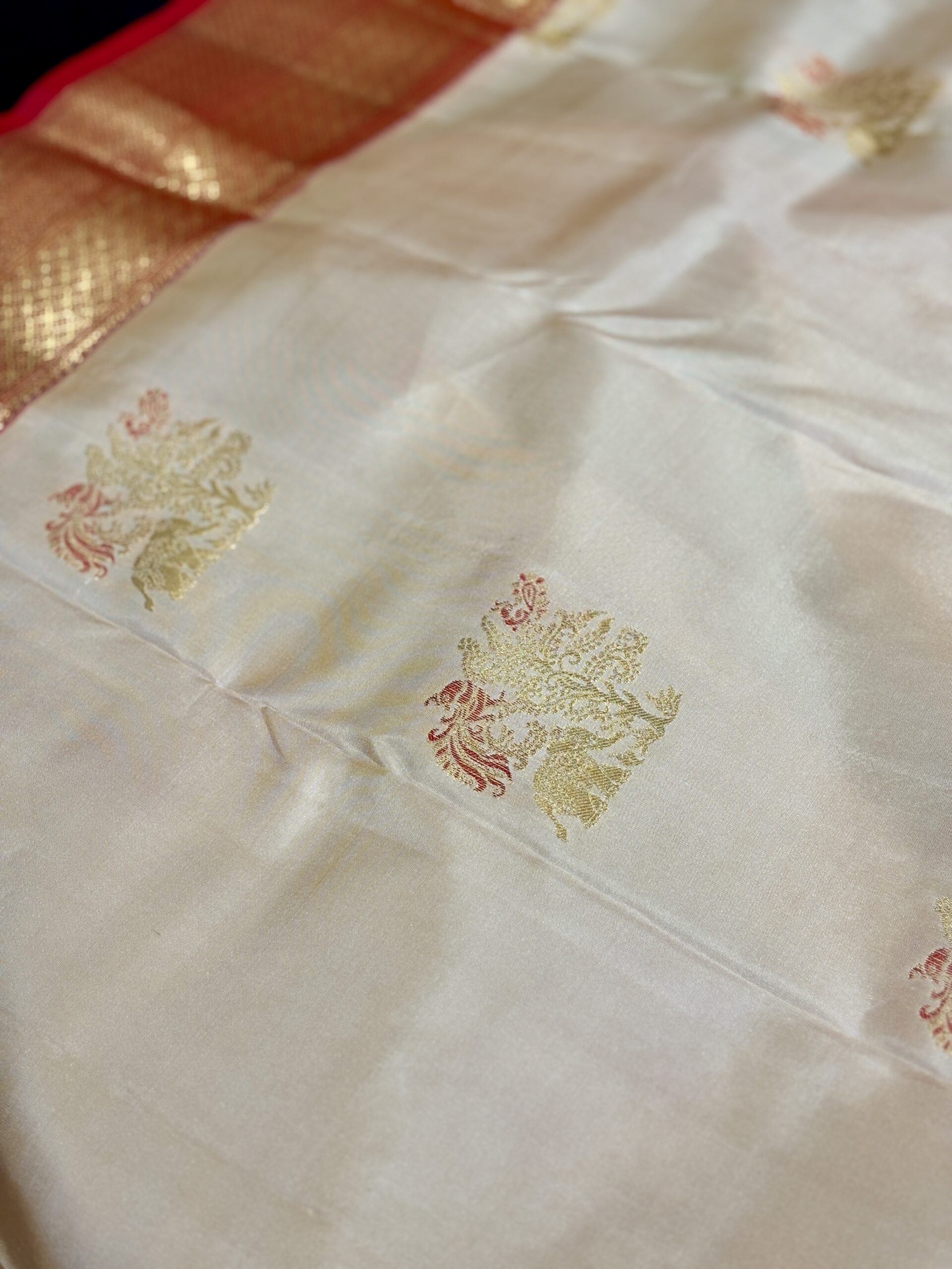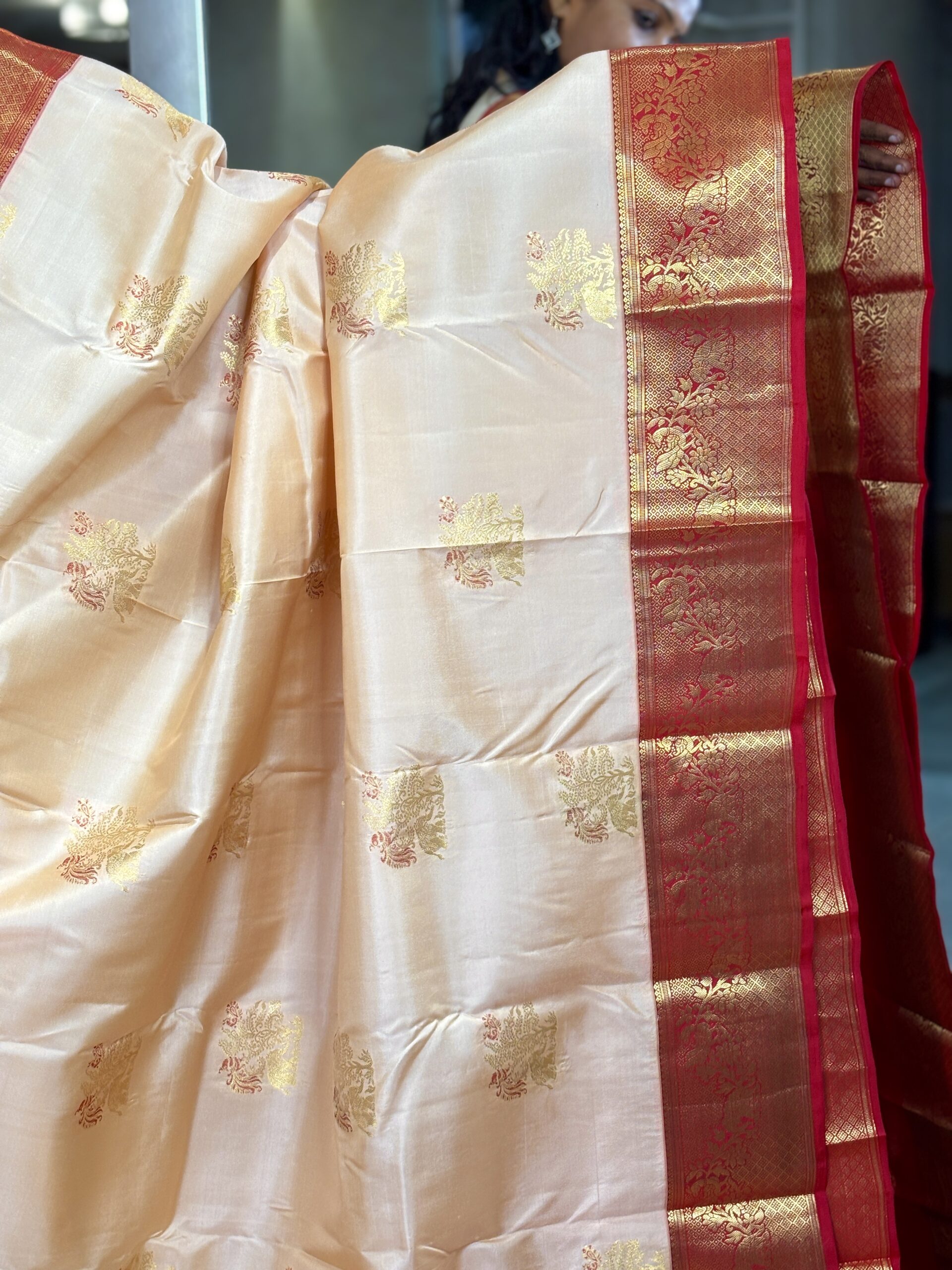 This pure Korvai Kanchipuram silk saree features a soft biscuit-toned body paired with a striking bright red contrast, creating a timeless and traditional combination. The saree is fully woven in rich gold zari, lending it a graceful sheen and classic appeal. Medium-sized gold zari bootas with subtle red highlights are spread evenly across the body, adding depth and visual interest.