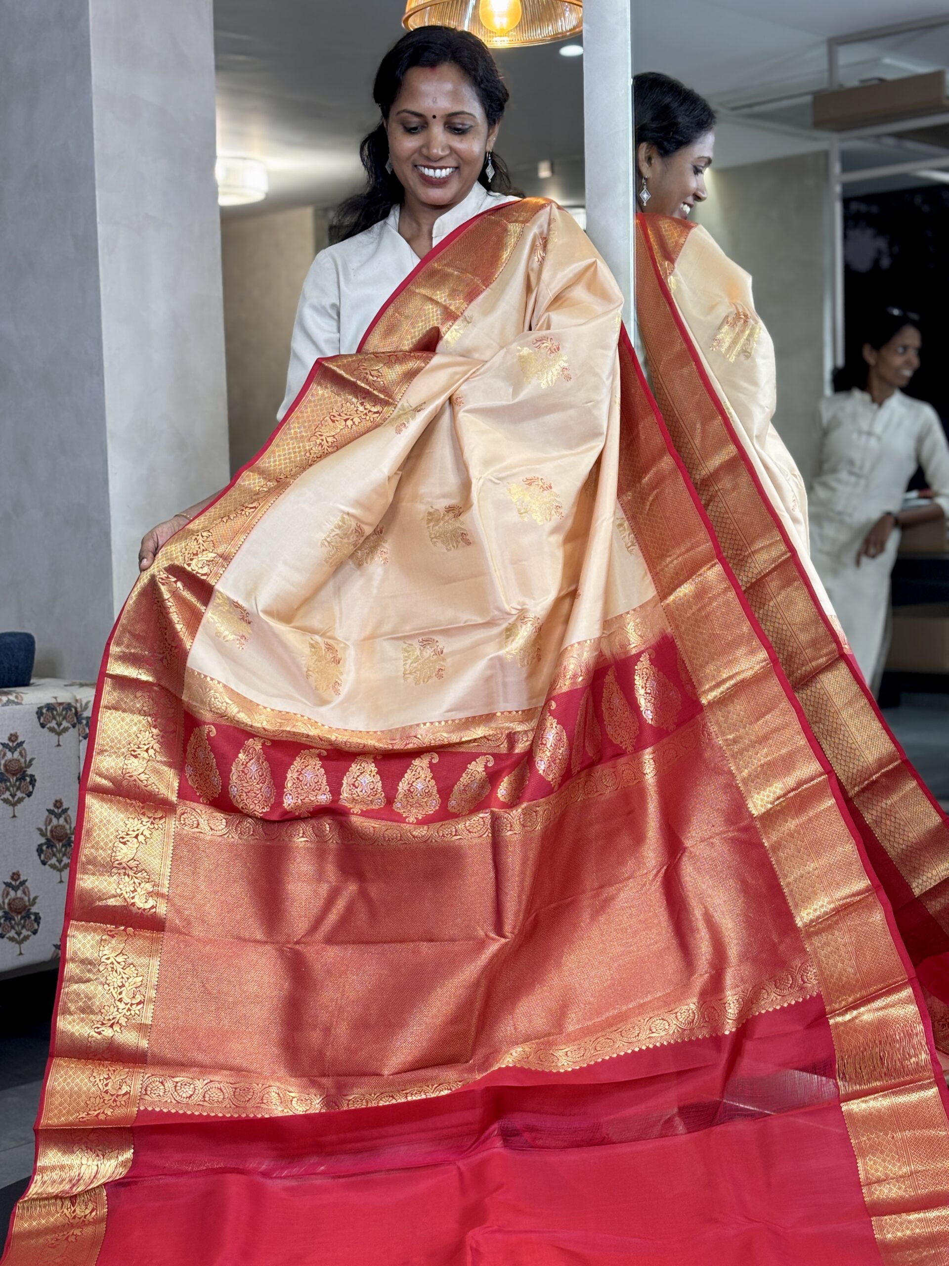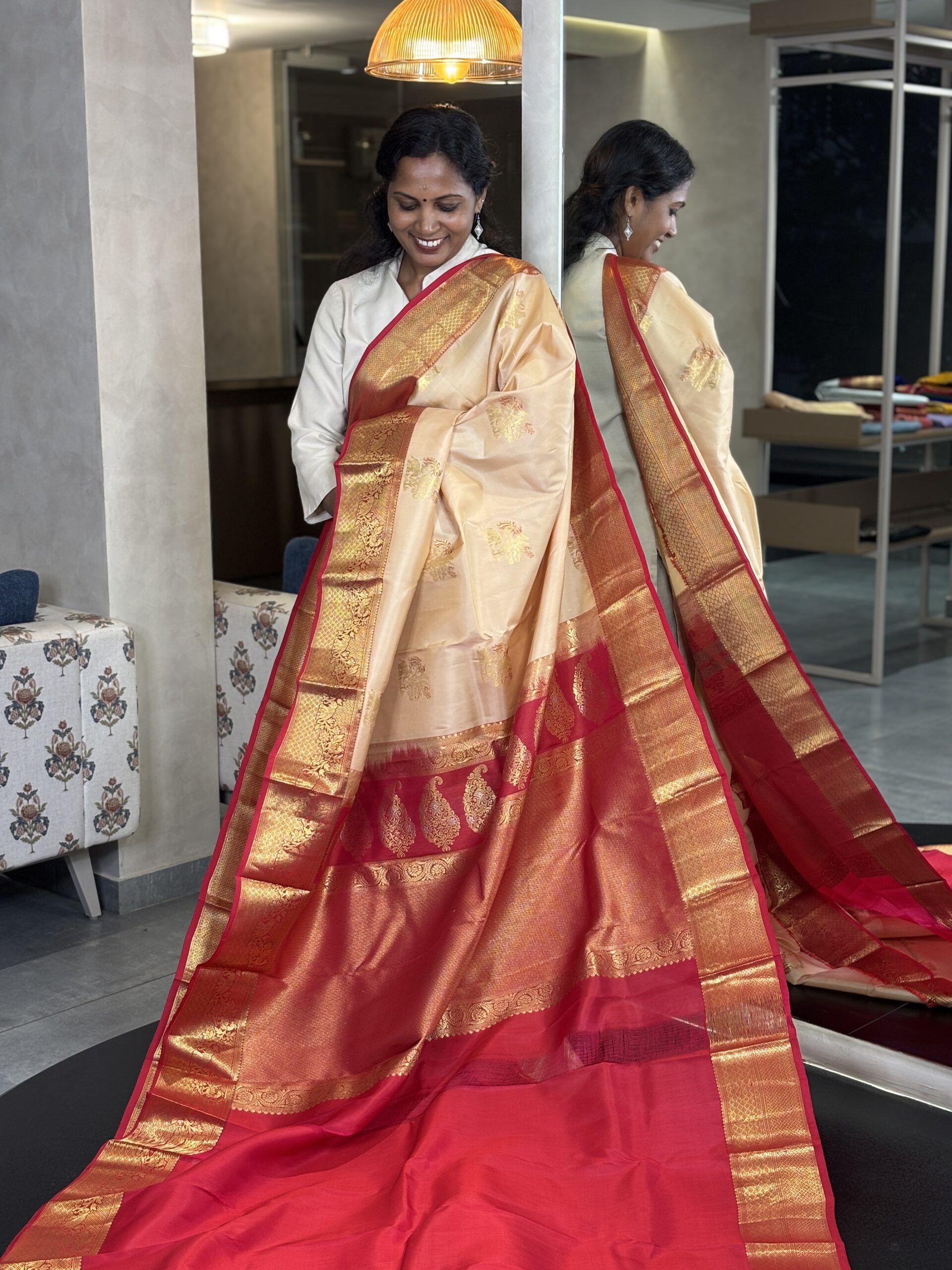 Pure Korvai Kanchipuram Silk Saree in Biscuit and Red