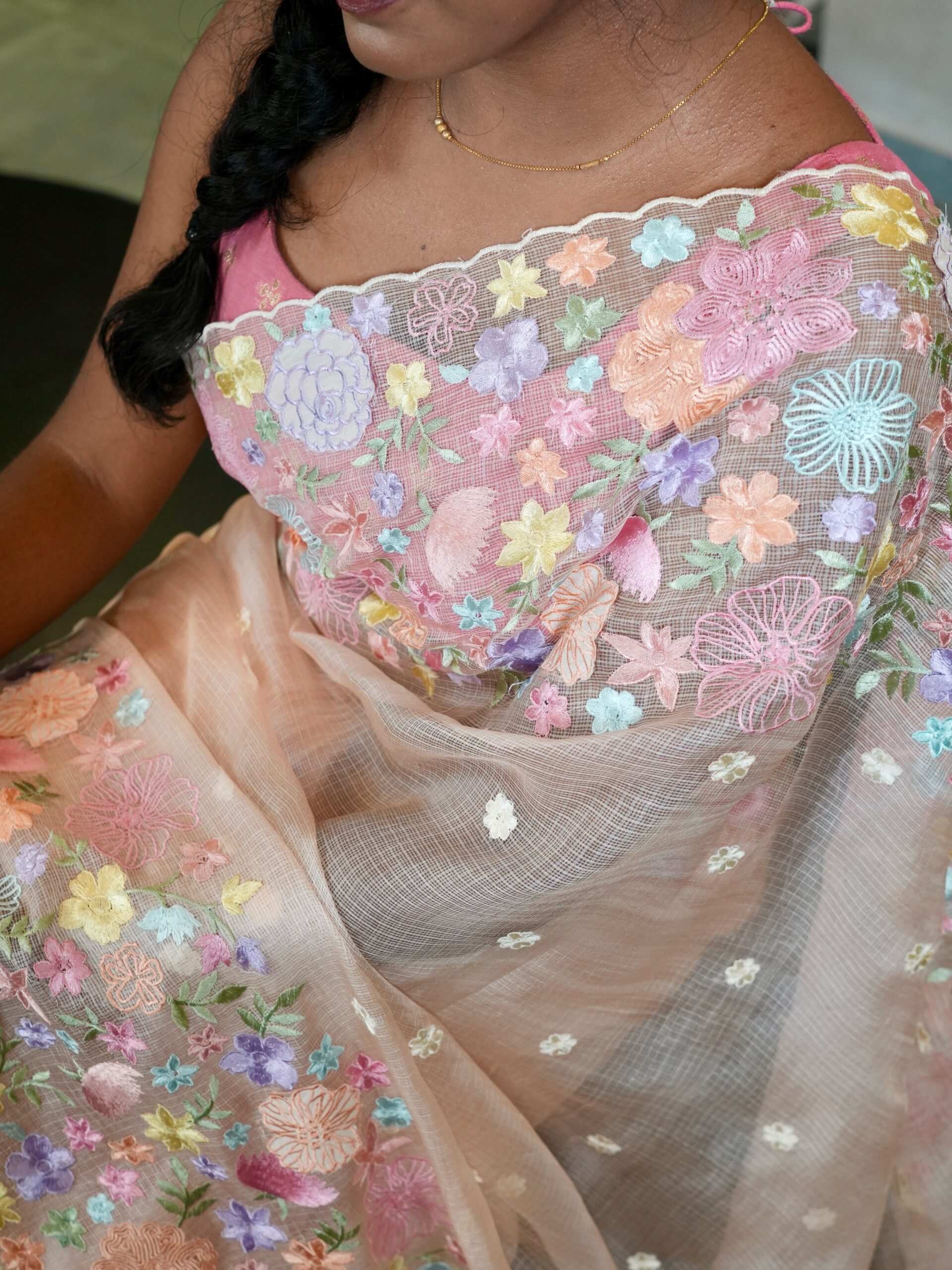 A charming blend of delicacy and detail, this Pure Kota Silk Saree stands out with its all-over multi-coloured floral embroidery that runs gracefully along both borders and continues across the body in scattered floral motifs. The lightweight Kota weave gives the saree an elegant transparency and a soft flow, making it effortless to drape and flattering in every silhouette.