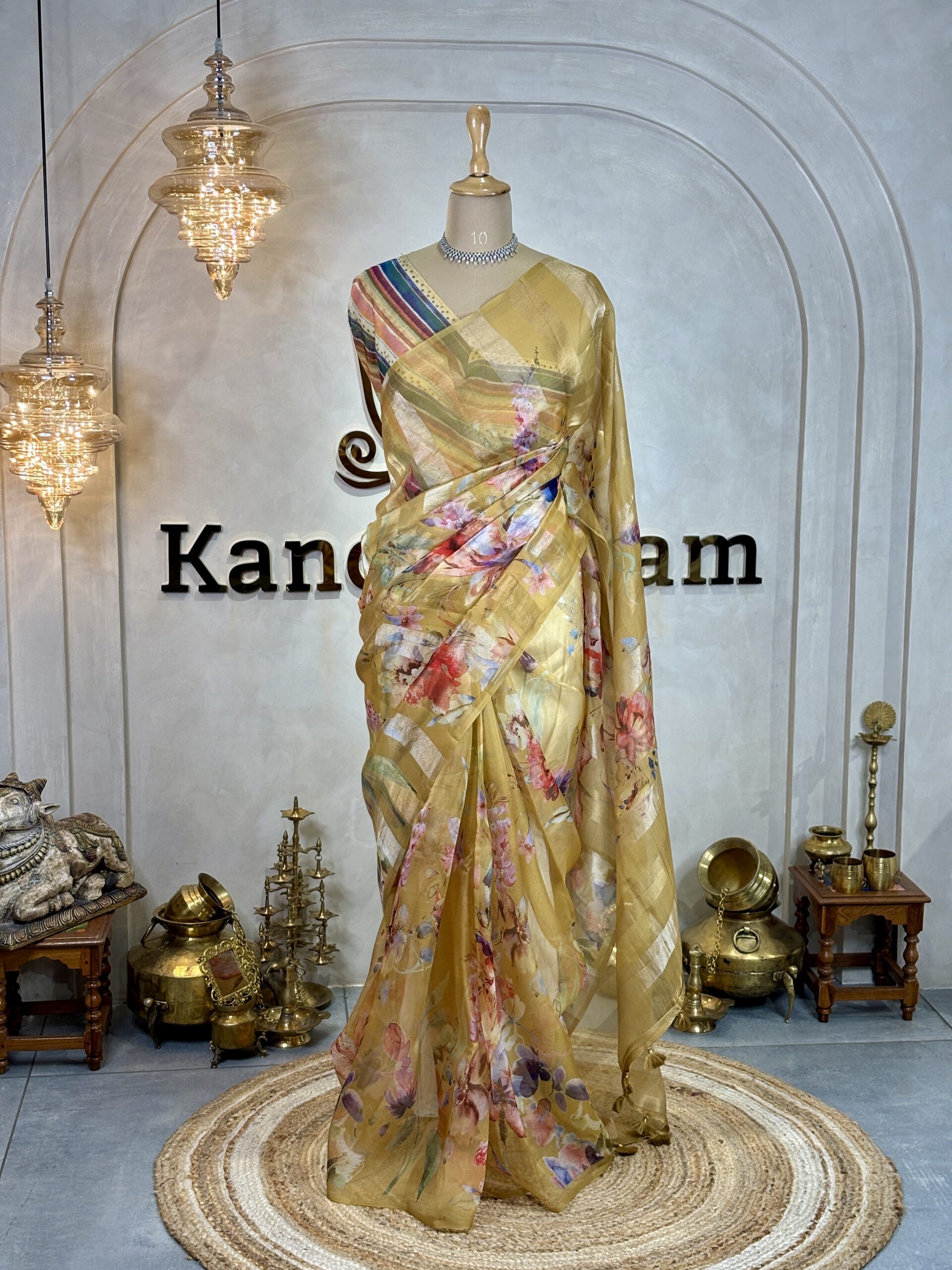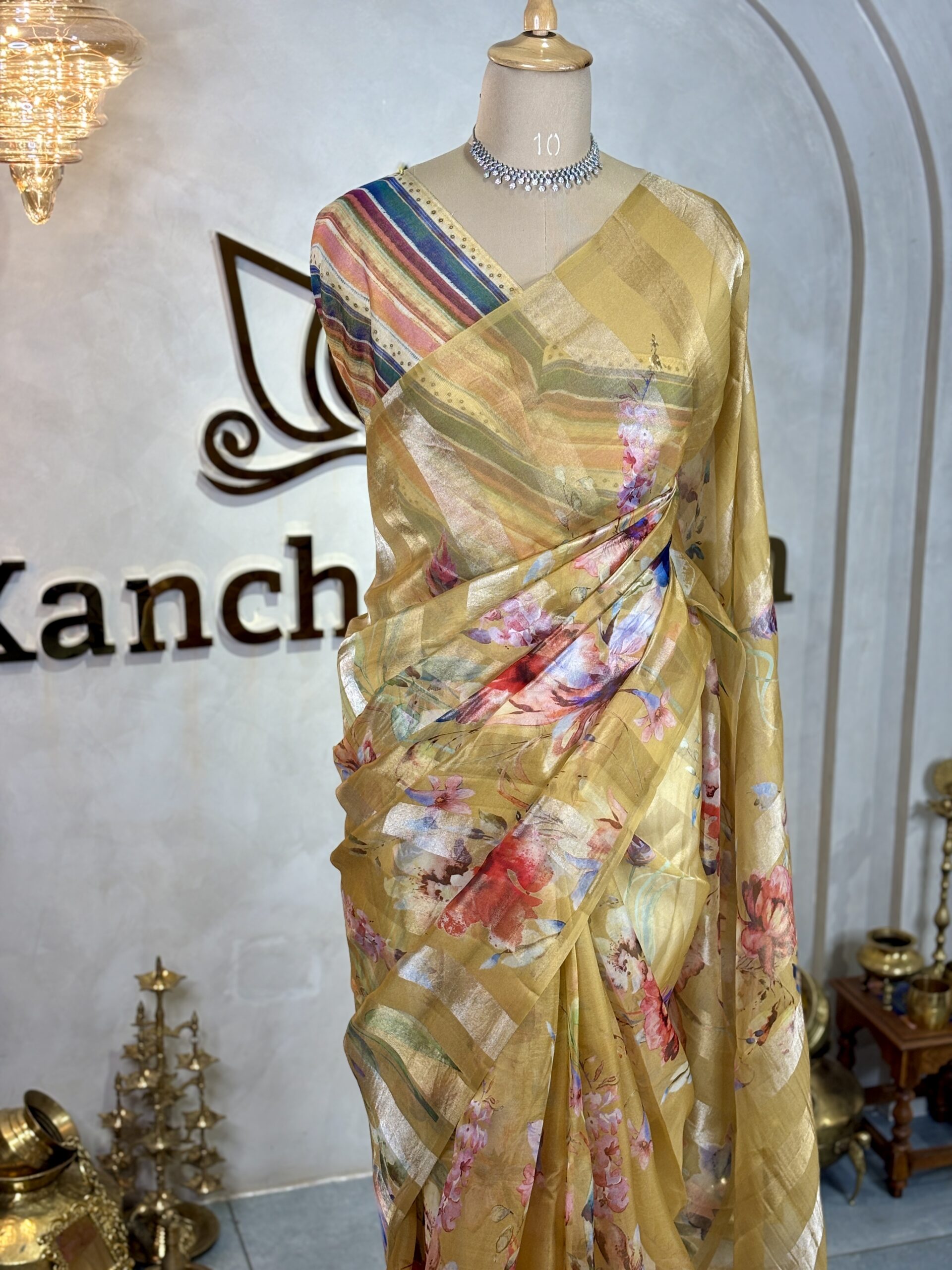 Crafted in pure organza silk, these sarees feature soft, fluid drapes paired with delicate floral prints spread gracefully across the body. The upper half of the saree, including the chest and pallu, is highlighted with alternating gold and silver tissue stripes, adding a refined sheen that blends seamlessly with the airy organza base.