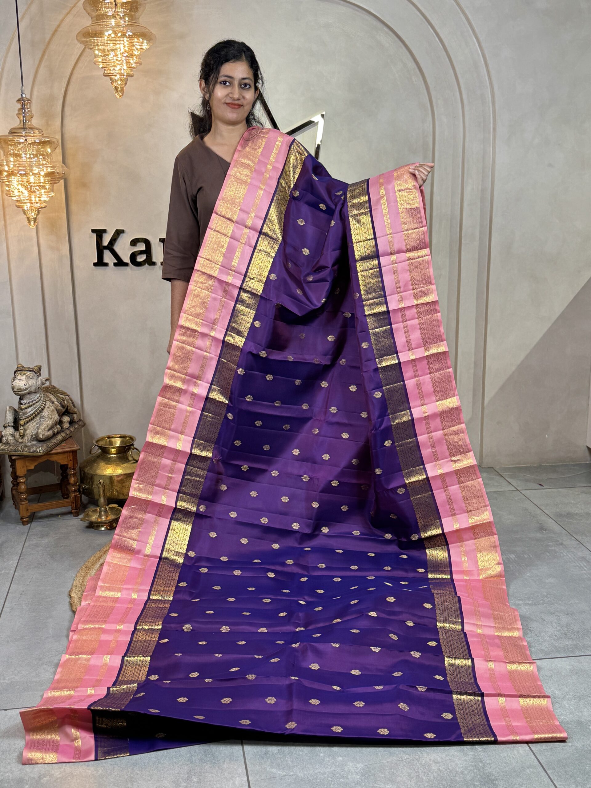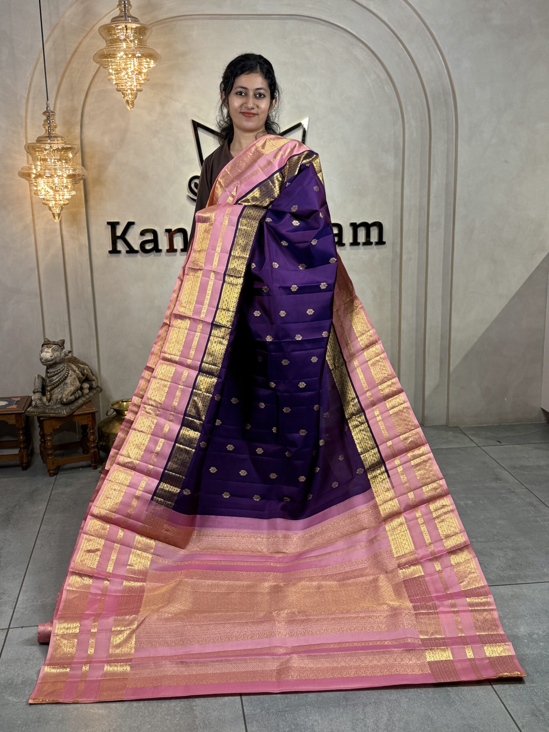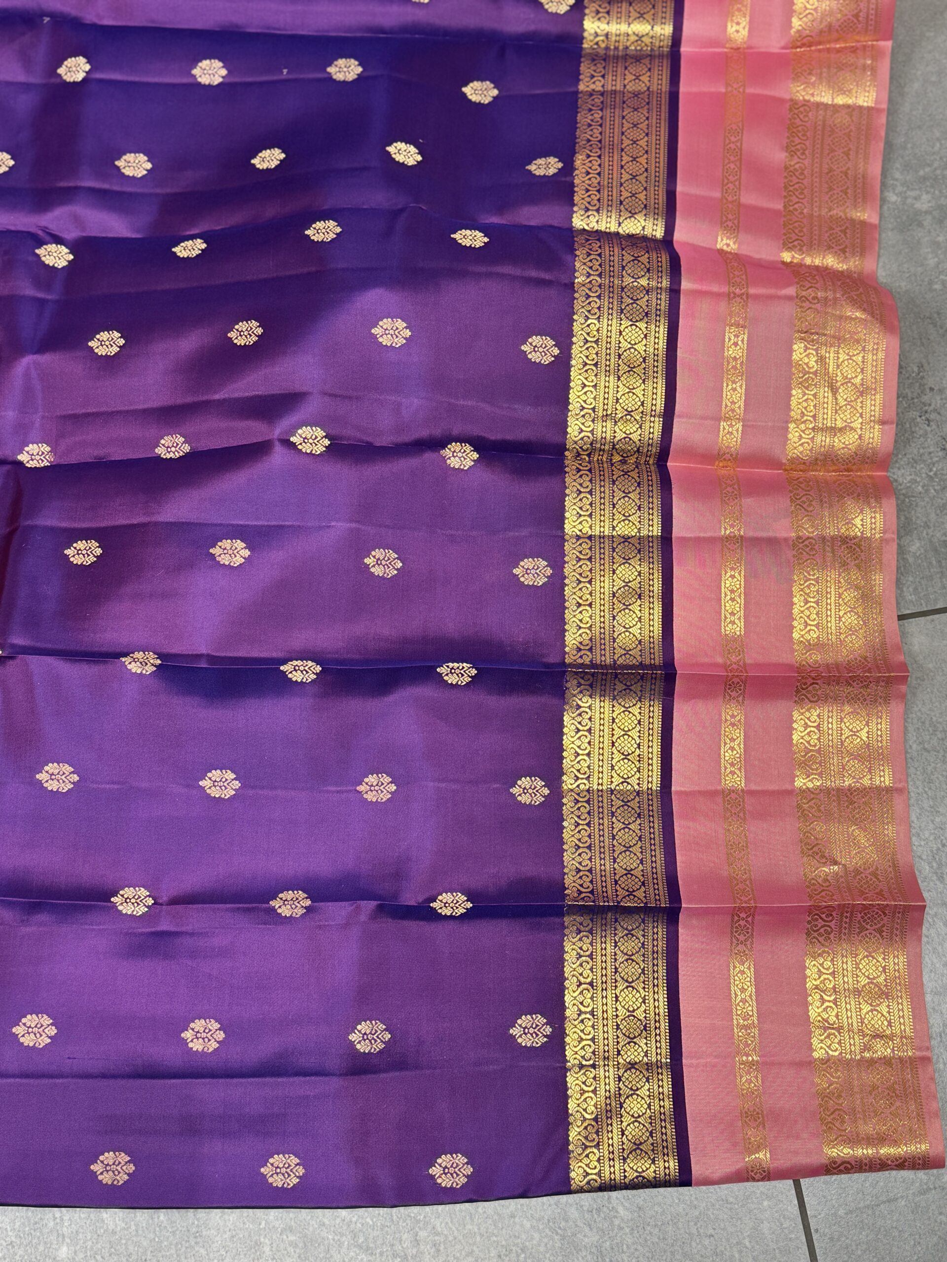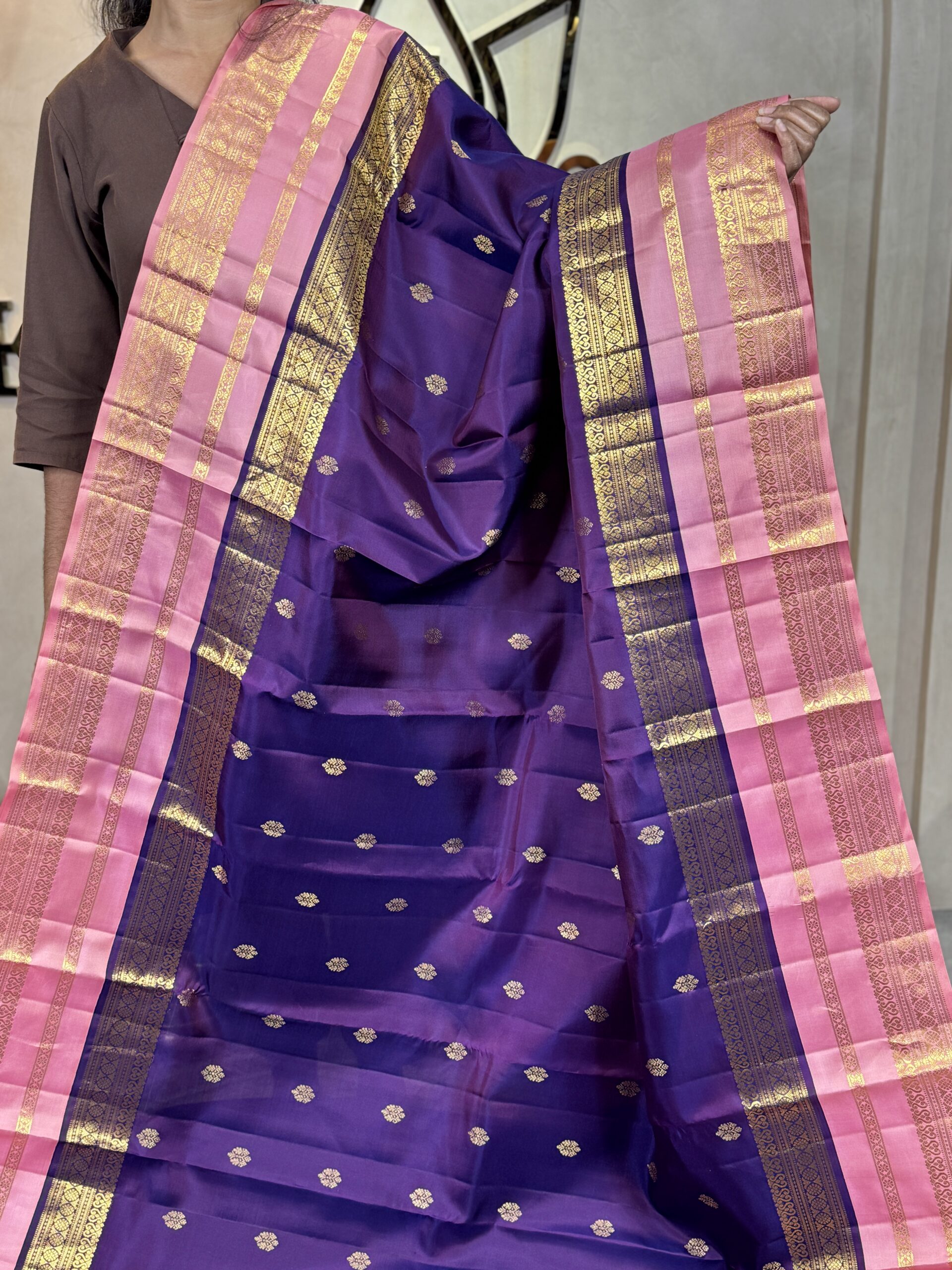 This pure Kanchipuram silk saree is woven in a rich traditional purple tone, beautifully adorned with small gold zari bootas scattered evenly across the body, lending it a timeless and graceful appeal. The silk has a smooth, lustrous finish that highlights the depth of the colour and the intricacy of the weaving.