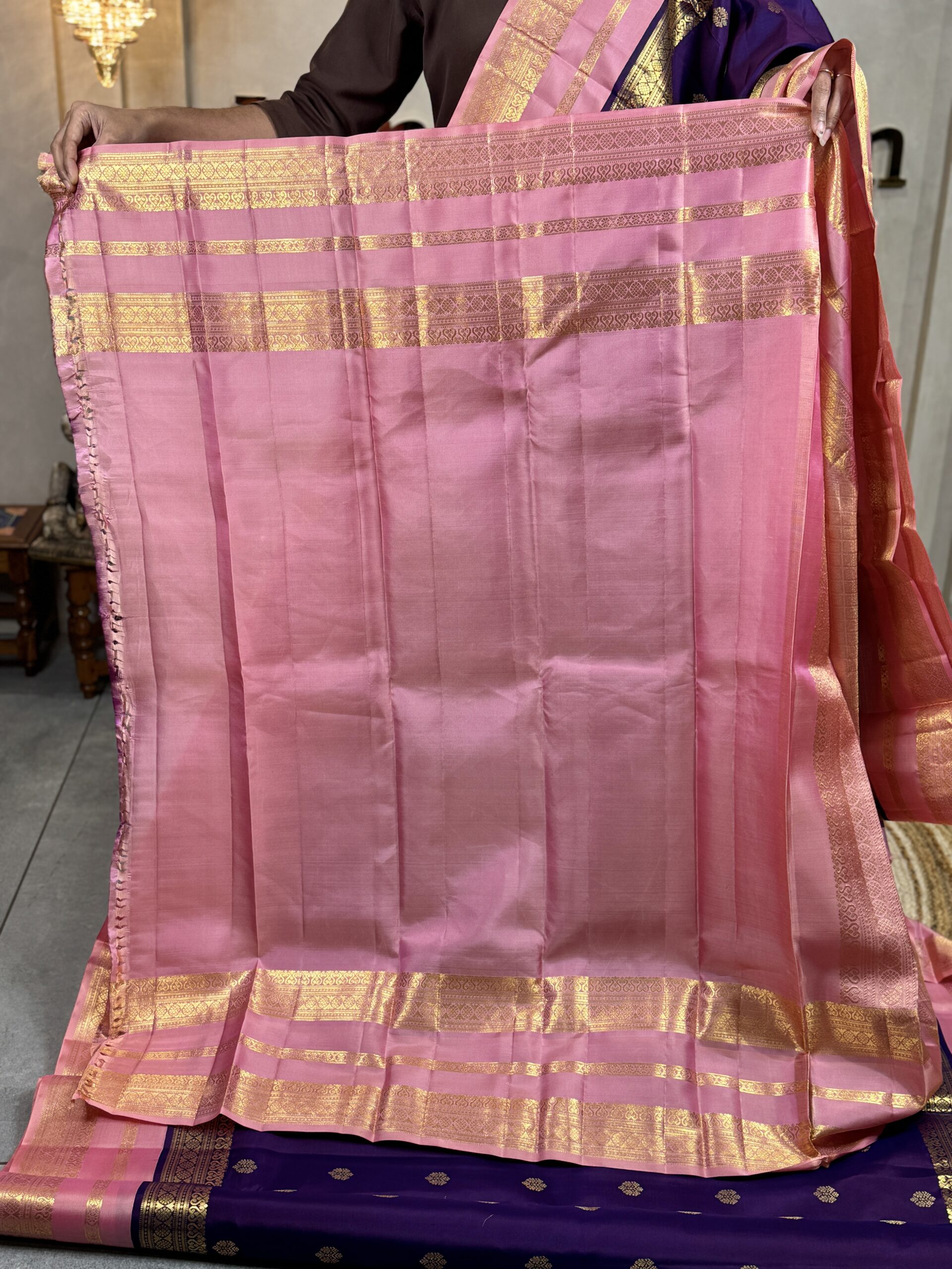 The saree is framed with contrast pink borders, richly woven in golden zari using classic Kanchipuram patterns, adding definition and traditional charm. The pallu is grandly woven in gold zari with a traditional weaving style that enhances the overall richness of the drape. The blouse piece comes in the same contrast pink tone with a plain body and matching zari borders, completing the saree as a balanced and elegant ensemble—perfect for weddings, festive occasions, and traditional celebrations.
