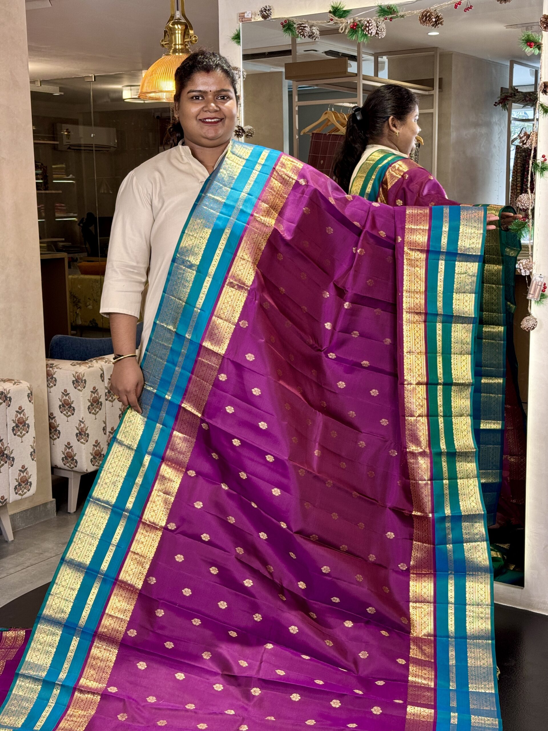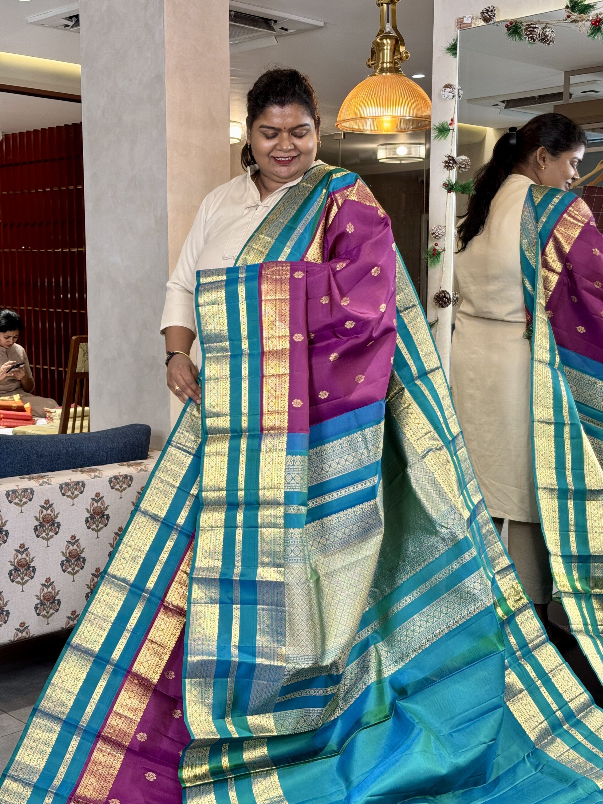 Purple Wine & Peacock Dual Tone Kanchipuram Silk Saree