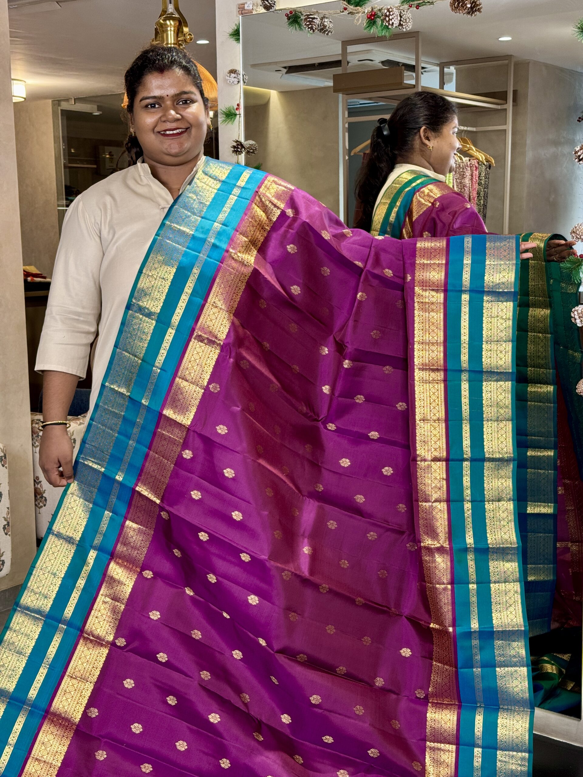 This pure Kanchipuram silk saree features a rich purple wine body, paired with a striking peacock dual tone contrast, adding depth and dimension to the overall palette.
