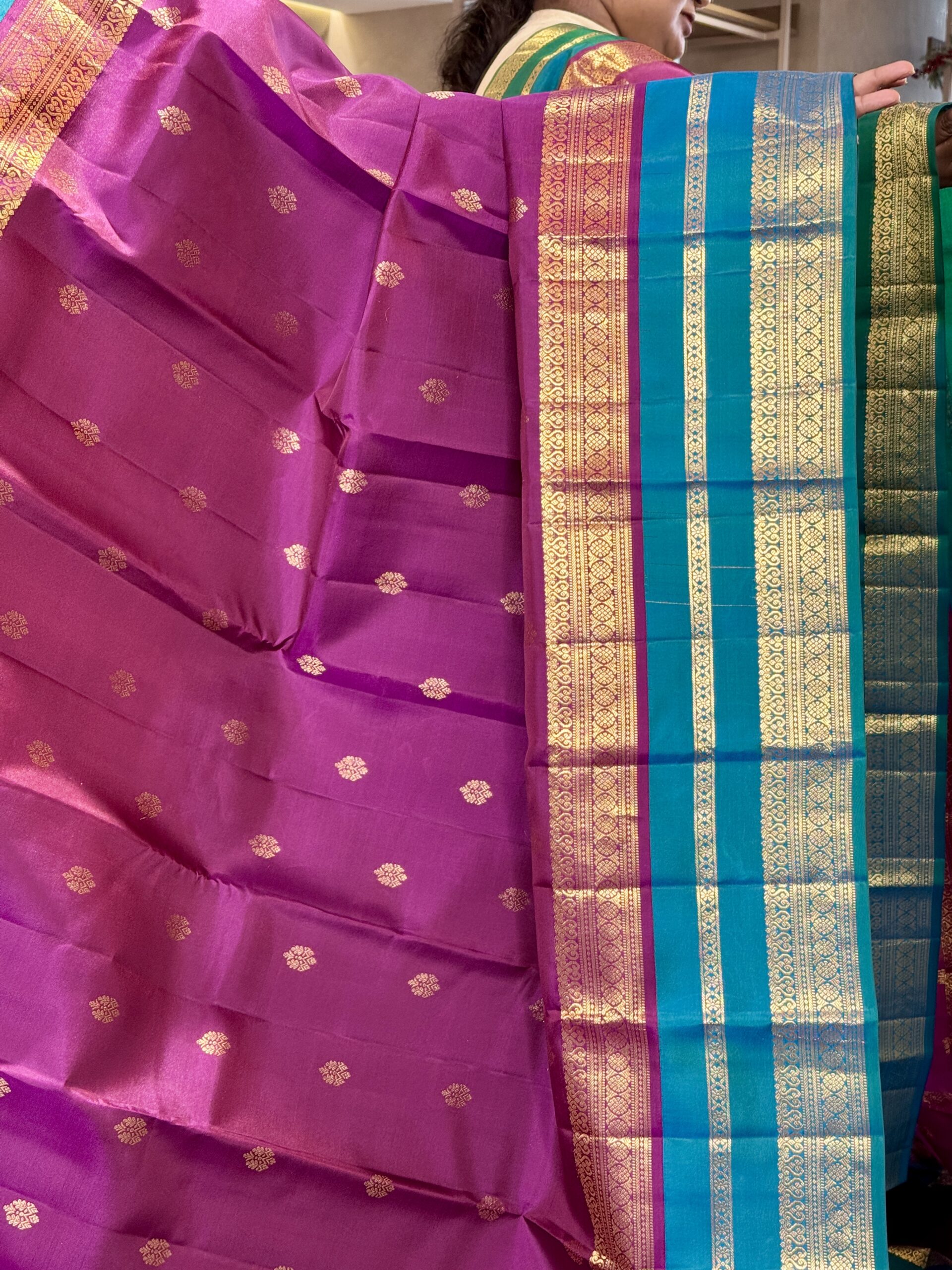 The body is woven with delicate gold zari bhoota motifs, evenly spread across the saree, giving it a refined and balanced look. Framing the saree are wide gap-style borders in the peacock dual tone contrast, fully woven in gold zari, lending it a bold yet traditional Kanchipuram identity.