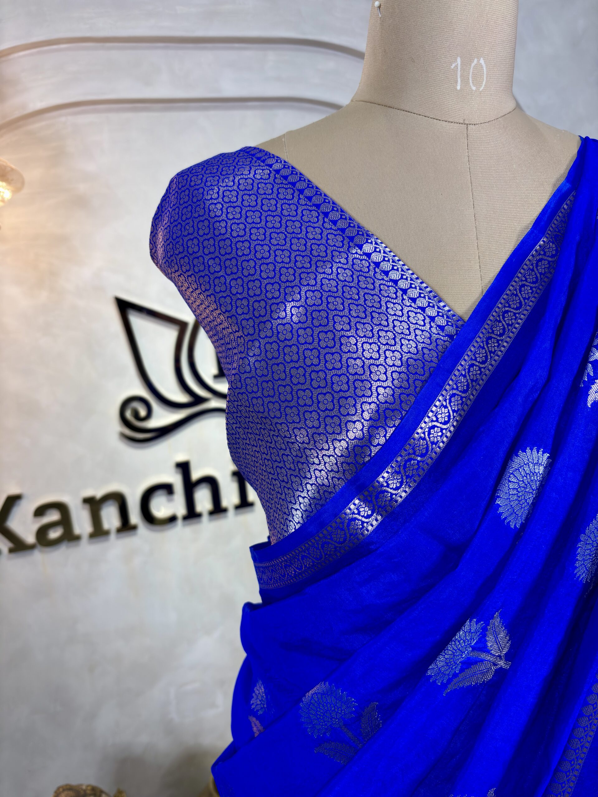 The pallu and blouse are richly woven in full brocade-style water zari, creating a grand contrast to the understated body. This interplay between a light body and a richly detailed pallu gives the saree its distinct character.